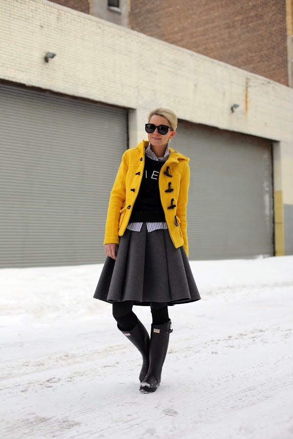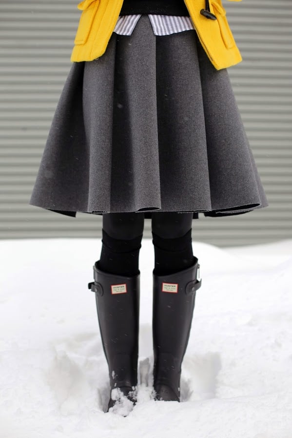 Coat: Old Navy (old but similar here and here). Sweatshirt: Madewell. Skirt: JW Anderson (also here). Boots: Rag and Bone X Hunter (also here). Woven Top: Madewell. Tights: DKNY. Socks: American Apparel. Sunglasses: Karen Walker ‘Super Duper’.