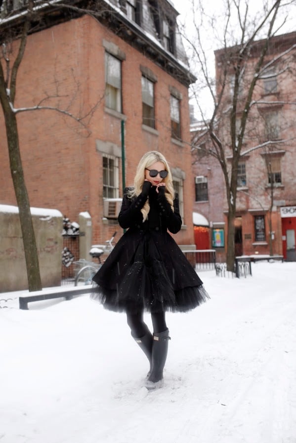 Skirt: ASOS (similar here). Turtleneck: Vince. Jacket: Alice and Olivia (similar). Boots: Hunter. Sunglasses: Karen Walker ‘Super Duper’. Lips: Stila ‘Beso’.