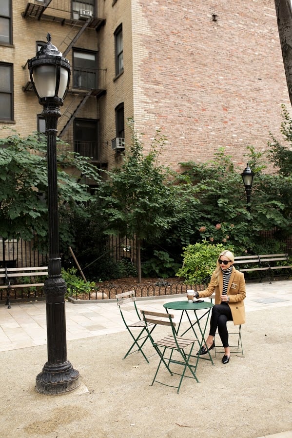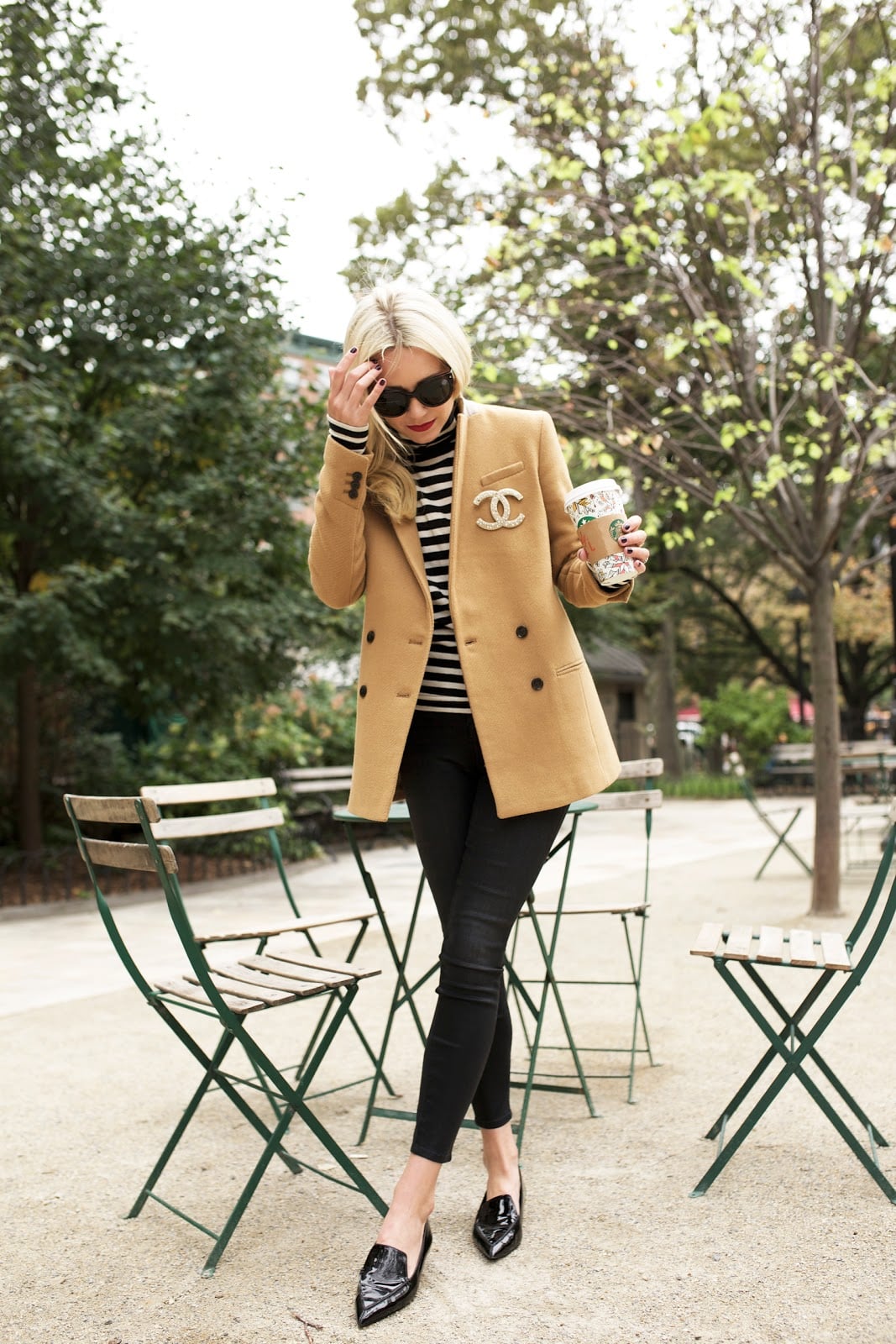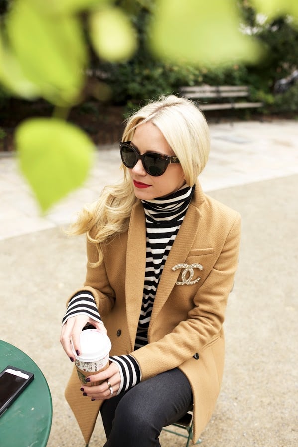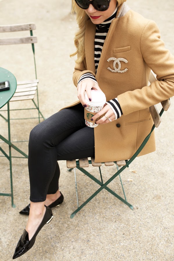 Turtleneck. Blazer, on sale (similar). Denim. Pin: Chanel (shop some here). Flats (also love the blush color). Nails: OPI ‘O Suzi Mio’. Sunglasses: Prada. Lips: Stila ‘Beso’.