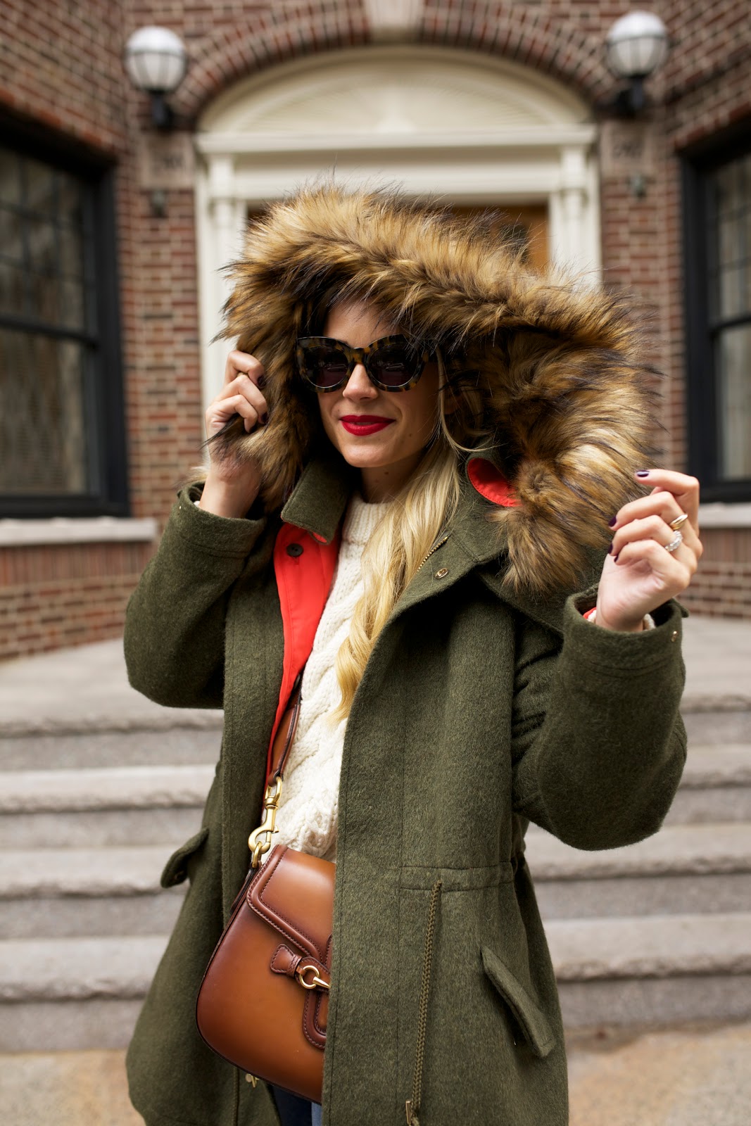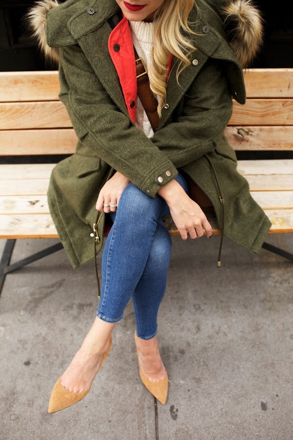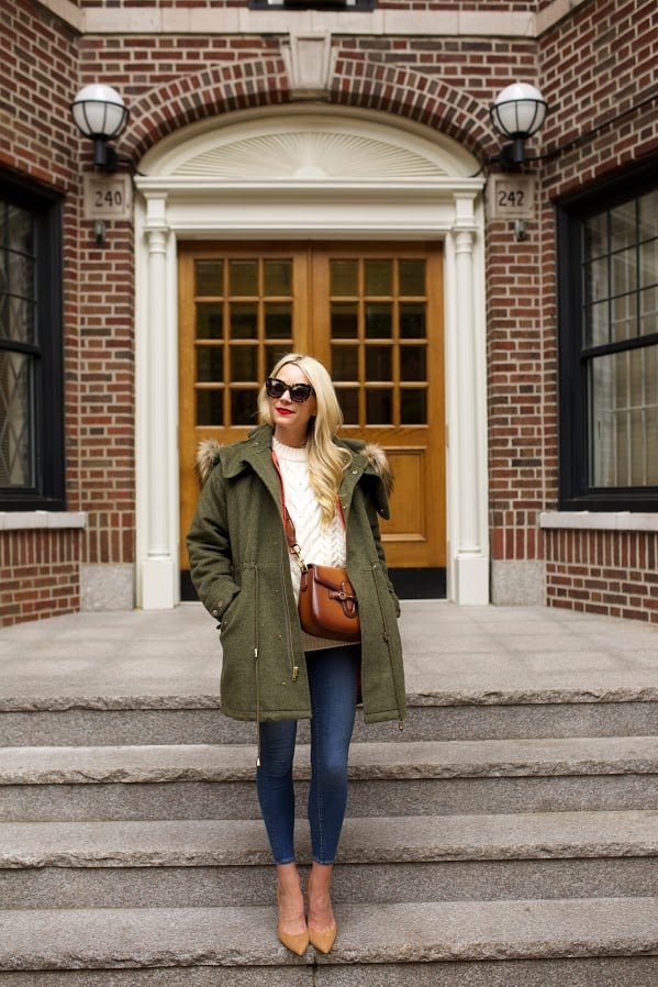 Denim. Sweater: Jcrew (similar here). Bag: Gucci. Parka: Boden c/o (also love this parka and this one). Sunglasses: Karen Walker. Lips: Stila ‘Beso. Shoes: Old (similar here).