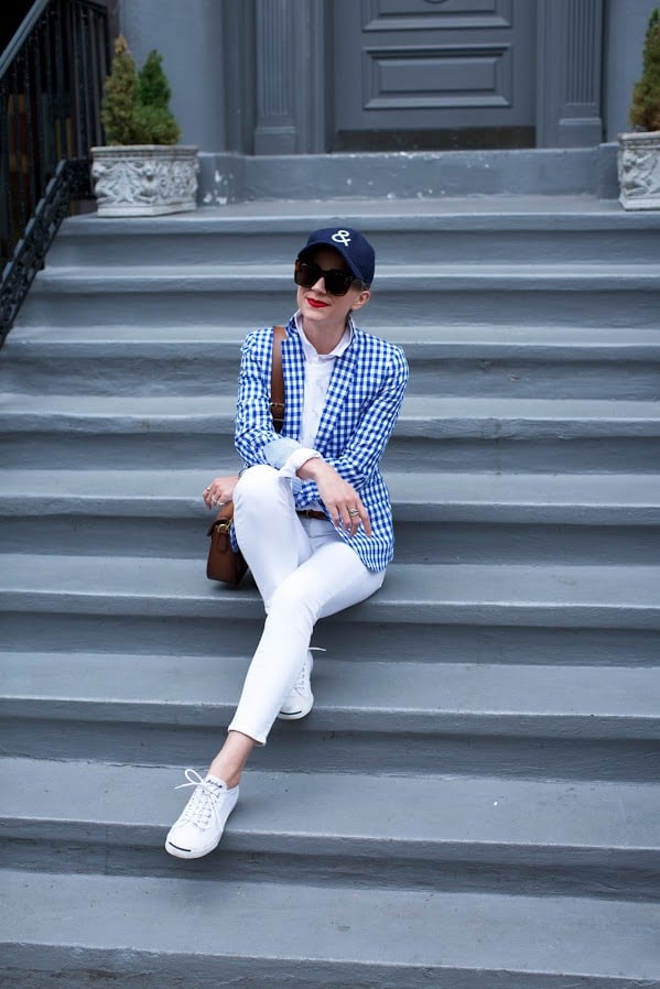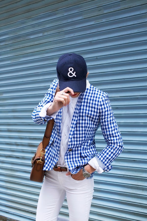 Blazer (also comes in pink and matching shorts here). Denim. Shoes: Jack Purcell. Lips: Stila ‘Beso’. Sweater. Hat: Gap (old, but similar cute one here).