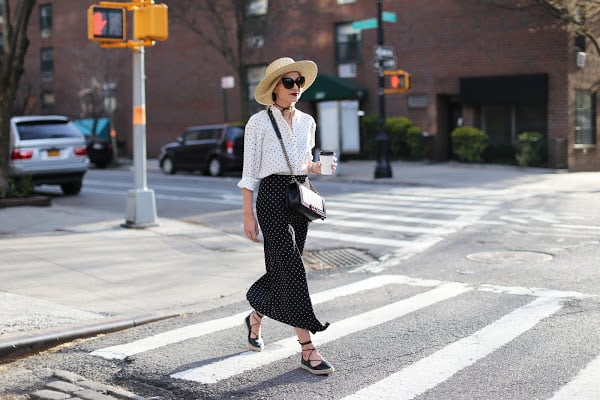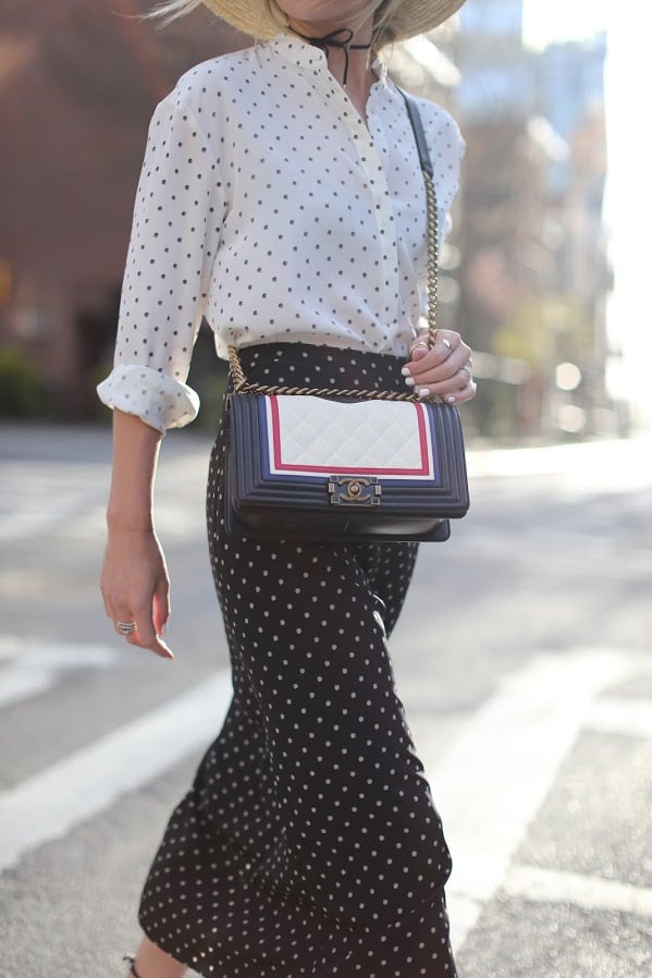 Top: Tibi. Skirt: Tibi. Also love the dress version here. Shoes: Zara (also bought these espadrilles and love these). Bag: Chanel. Choker Necklace: Bauble Bar (shop more chokers here). Boater Hat. Nails: Deborah Lippmann. Lips: Stila.