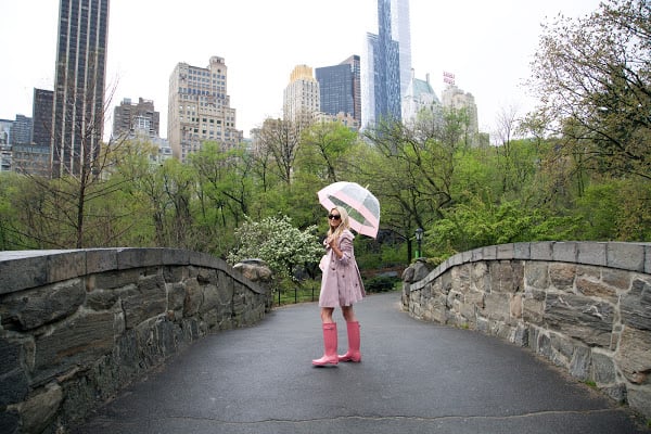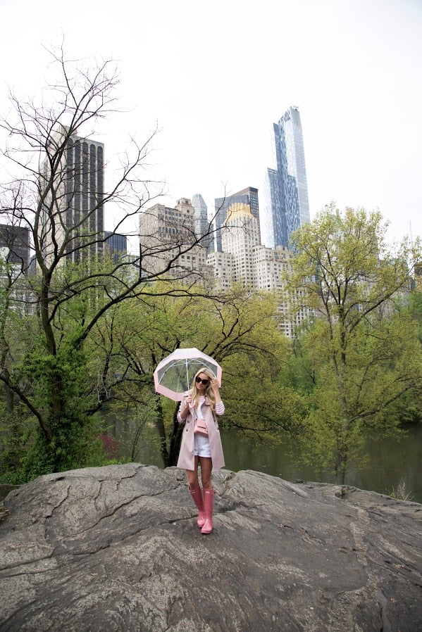 Overalls: Madewell (last seen here). Boots: Hunter (also shop here). Tee: Jcrew. Trench: ASOS. Bag: Chanel (chain wallet in pink here). Sunglasses: Linda Farrow.