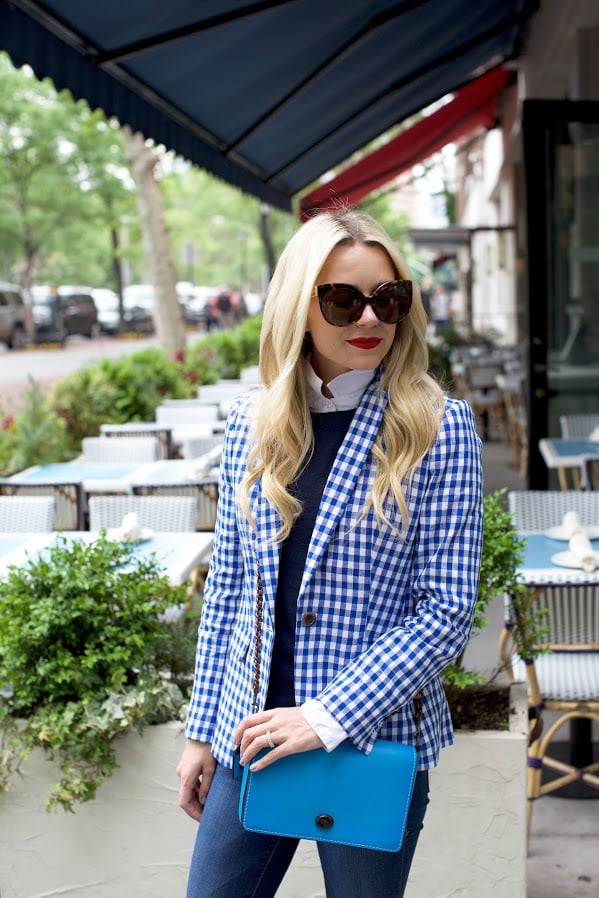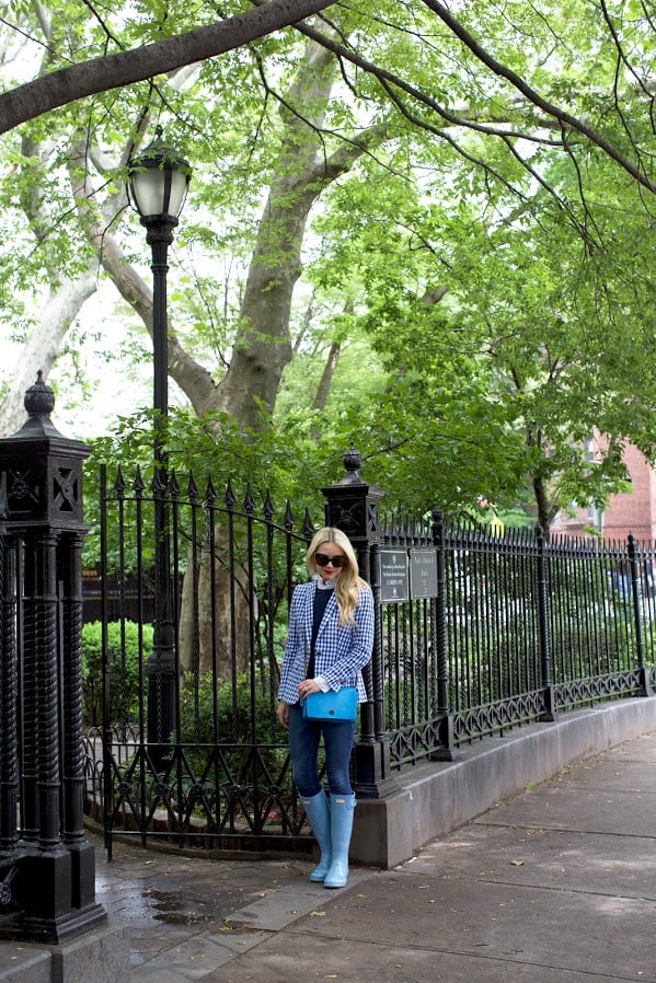 // one // Bag: Coach (see my other Coach picks below). Blazer and Sweater: Jcrew. Denim: Frame. Boots: Hunter.