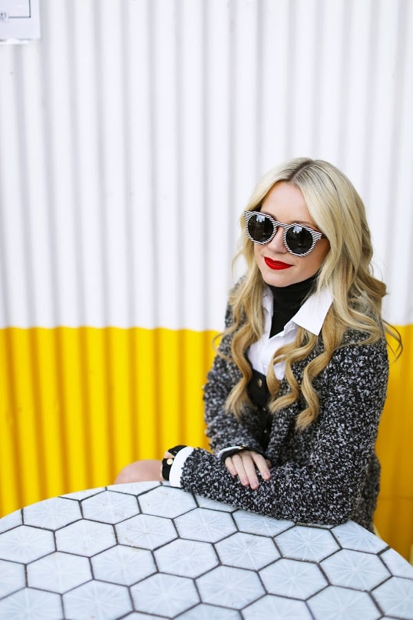Boucle Coat: BB Dakota. Overalls: HM. Shoes: Sam Edleman (also love these). Sunglasses: Illesteva. Lips: Stila. Top: Michael Kors (not wearing the bow here!). Bag: Chanel (I have been eyeing this chanel and this one)