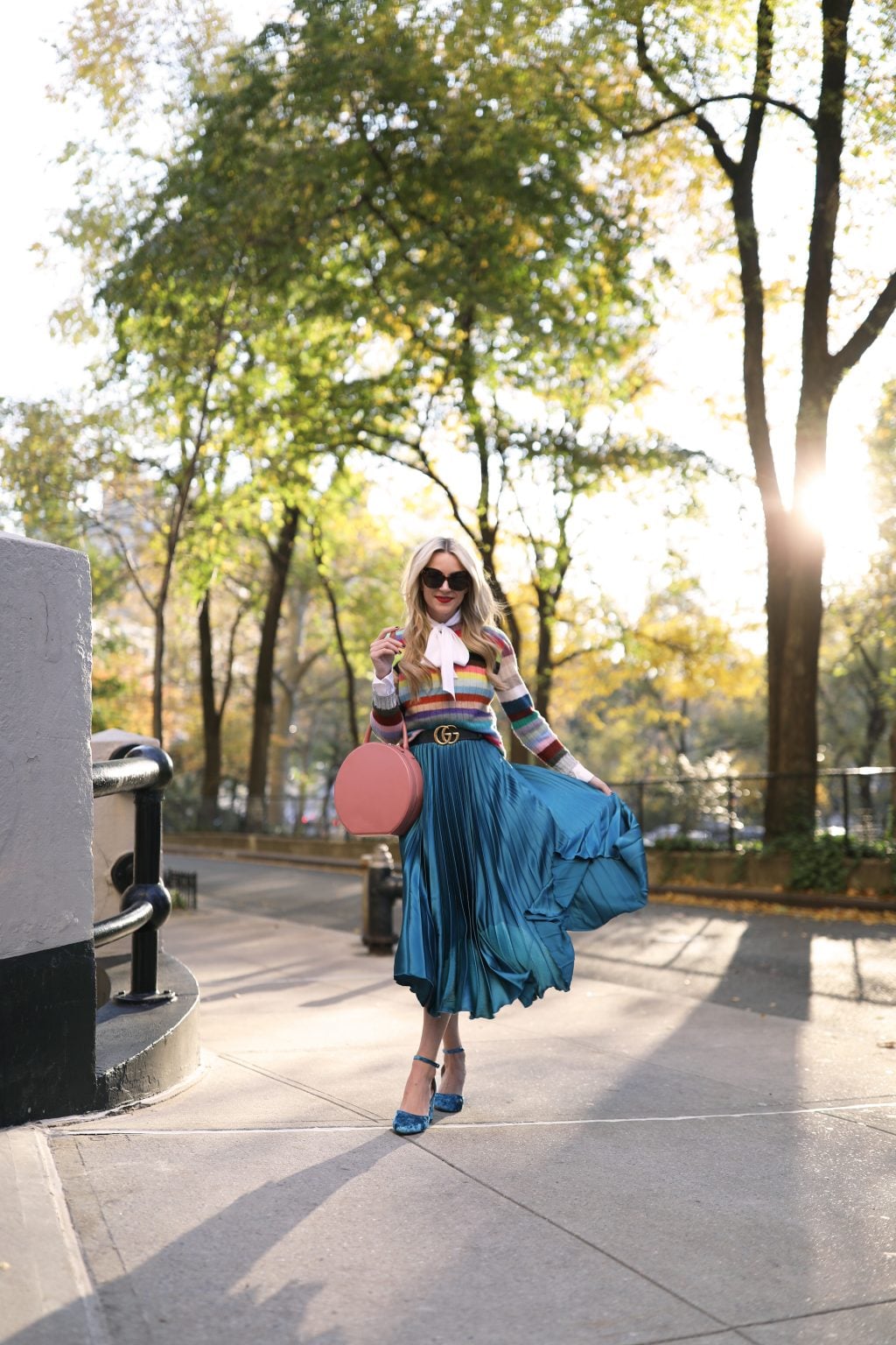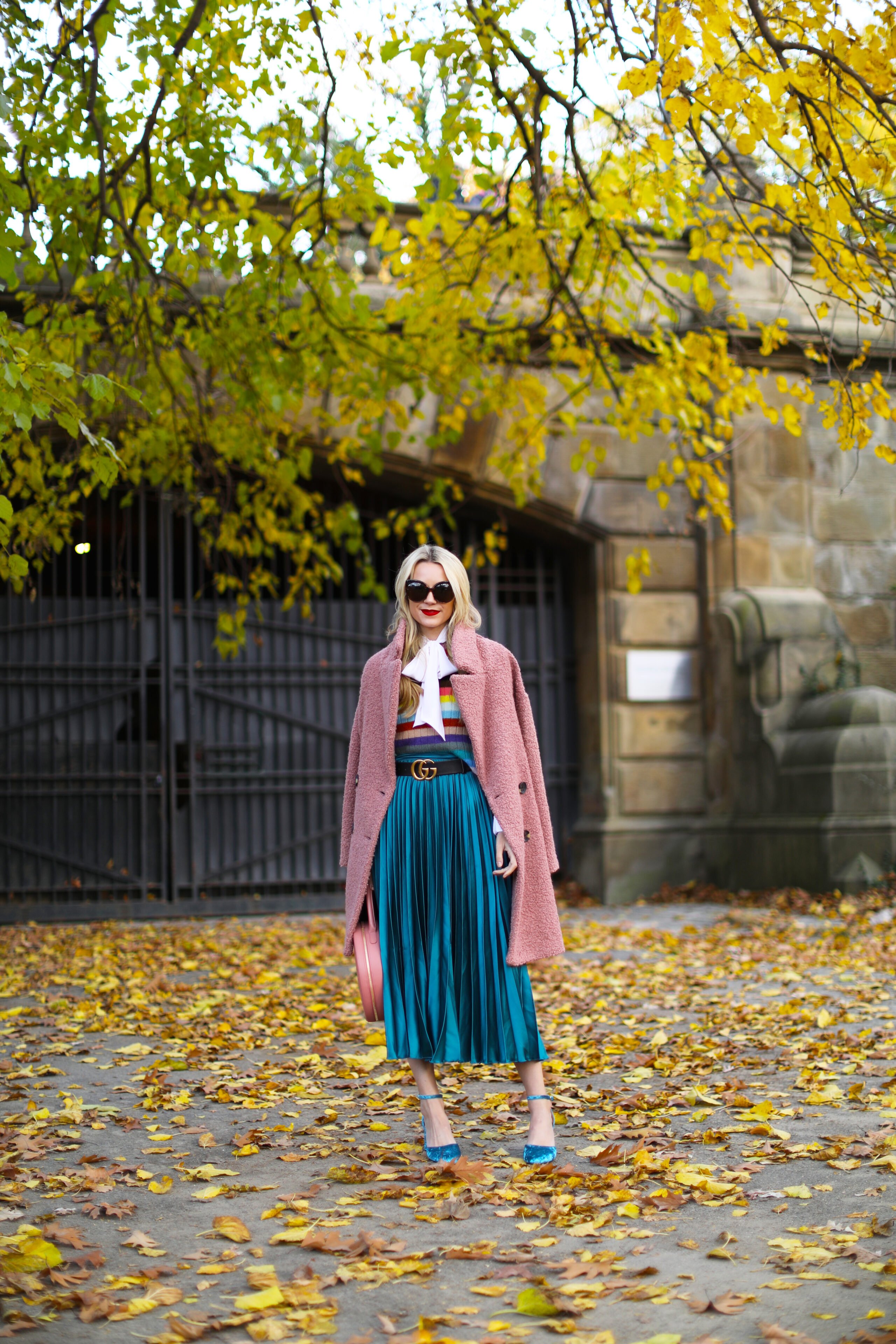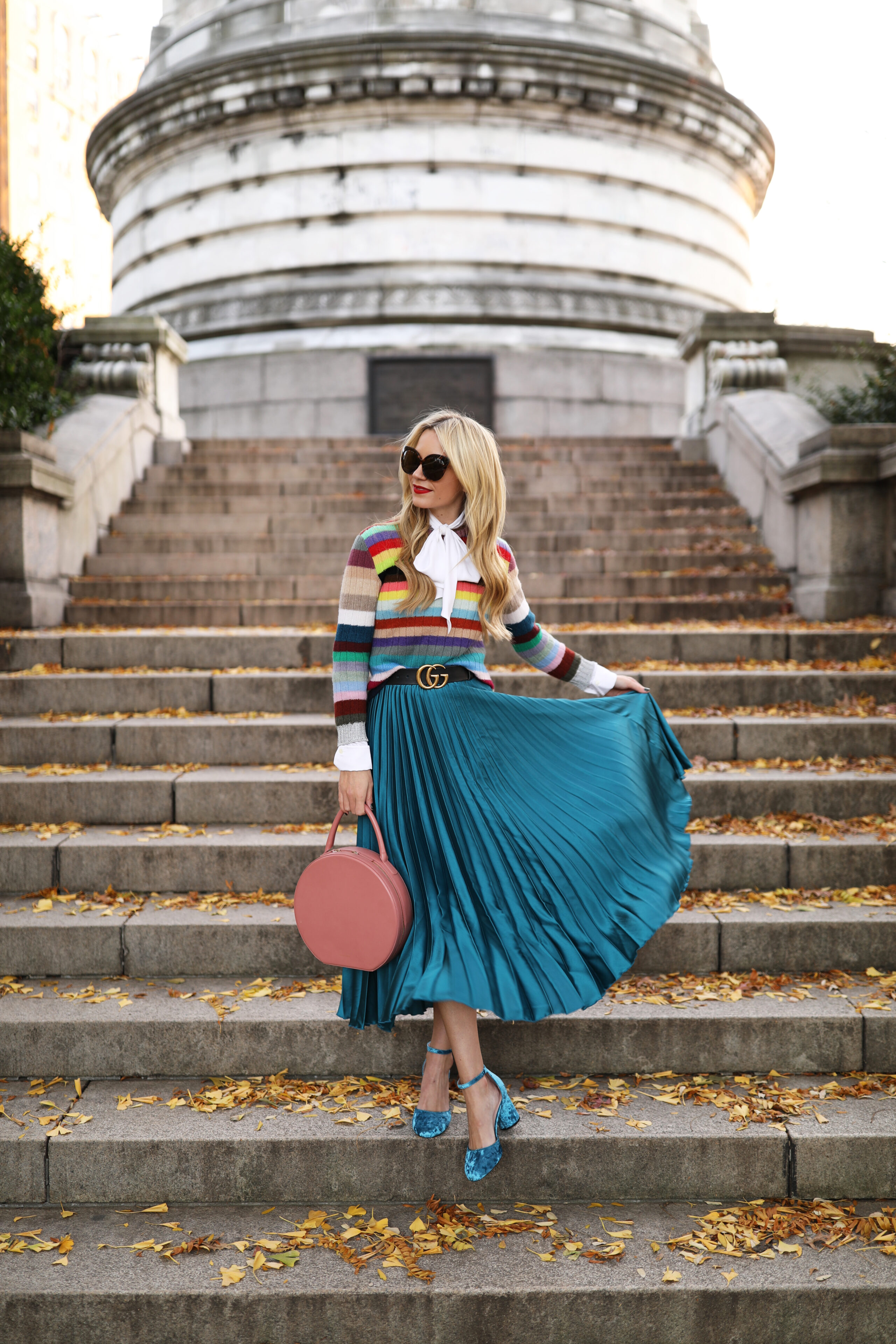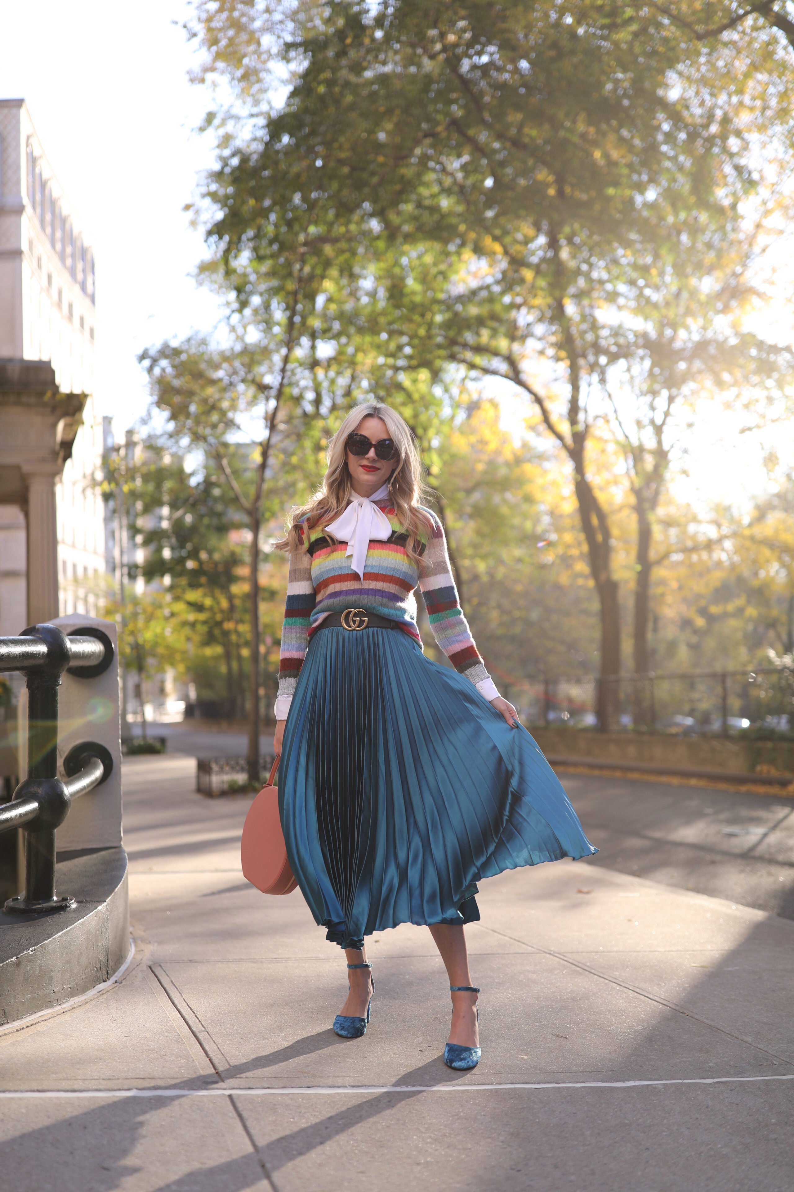 Shoes: Topshop. Skirt: Sold out (similar here and here and see all of my pleated midi picks here). Pink Coat: Topshop. Strip Rainbow Sweater: Gucci (similar). Bow Blouse: Frame. Sunglasses: Linda Farrow. Belt: Gucci. Lips: Stila. Thank you to Nordstrom for partnering on this post.