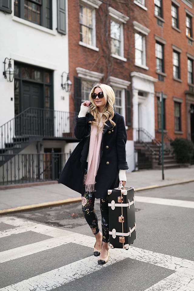 Travel style // Pants: 7 For All Mankind (on sale, also here). Coat: Red Valentino. Scarf: Burberry (similar). Luggage: Steamline. Flats: Chanel. Sunglasses: Linda Farrow. Sweater: Old, similar here. Lips: Stila Baci.
