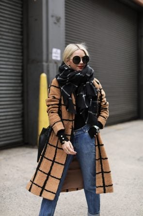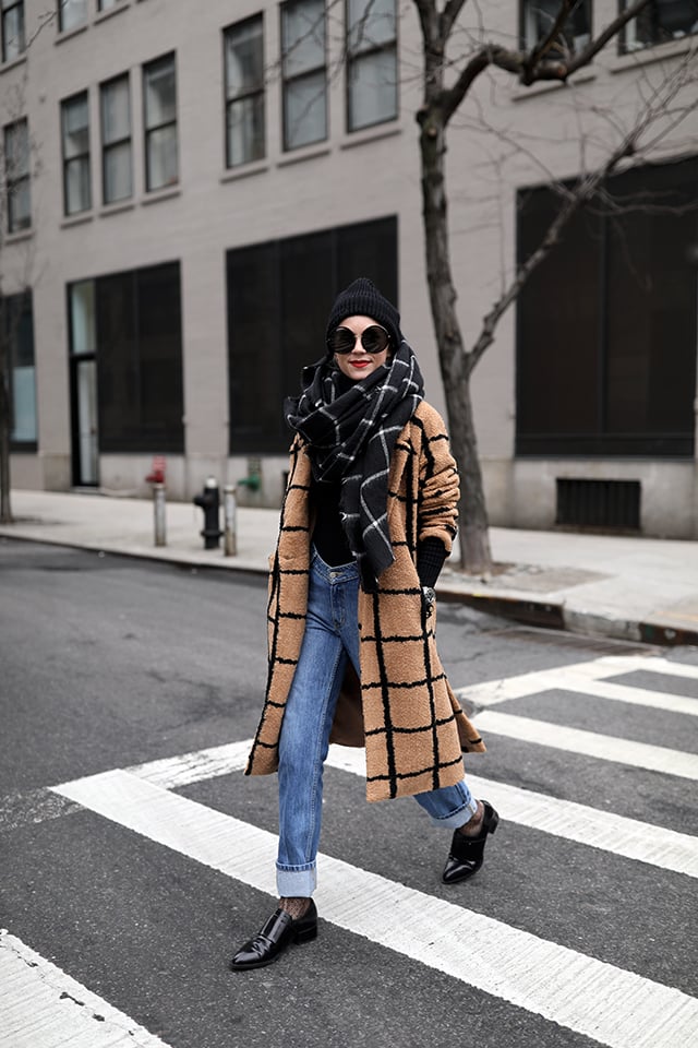 Coat: Lavish Alice. Denim: Opening Ceremony (I am obsessed with this denim fit). Scarf: Old, Similar. Sunglasses: Linda Farrow. Loafers: Vince, old but love these Everlane new loafers. Bag: Mansur Gavriel. Fishnet Stockings. Beanie.