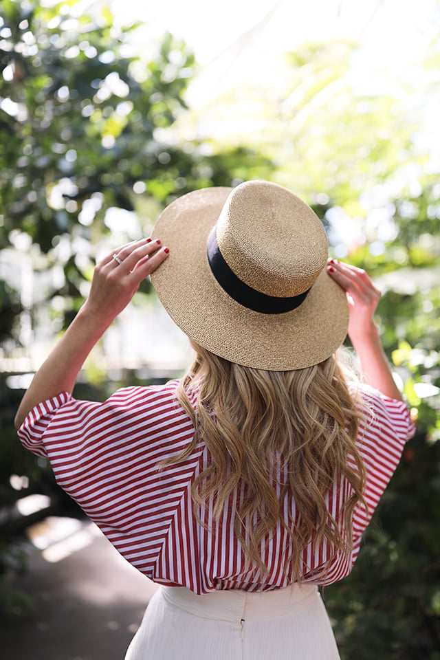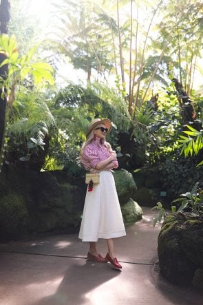Bag: Nannacay (see more of my favorite straw and basket bags for spring here). Skirt: CMEO. Shoes: G.H. Bass Loafers (I also have them in this adorable pink- as seen here and here). Top: Petersyn (I love this shirting brand– love this top from last summer!). Hat: Gucci. Earrings: BaubleBar. Sunglasses: Le Specs (only $69).