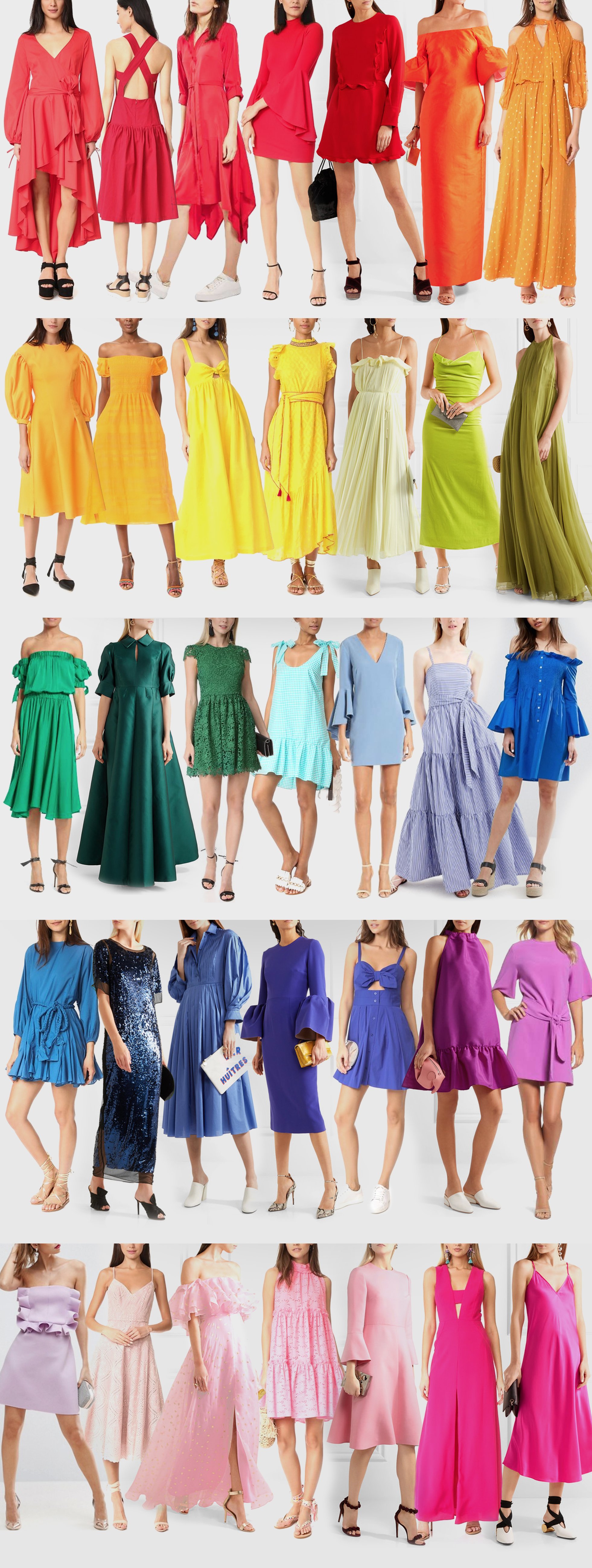 The second installment of summer dress week focuses entirely on rainbow colors. I’ve never been shy in choosing color in my dress choices. When the temperatures rise in the summer season, I tend to amp up the hues in my wardrobe, often gravitating towards more primary rainbow colors. Today’s outfit post is a primary example – no pun intended. While there are only seven colors in the rainbow to choose from, there are seemingly infinite shades in between. The collage below expresses my love for rainbow colors while showcasing a few of my favorite new summer dress picks. I hope you will be inspired to inject some new bright and bold colors into your dress wardrobe this summer season! Shop away below…
