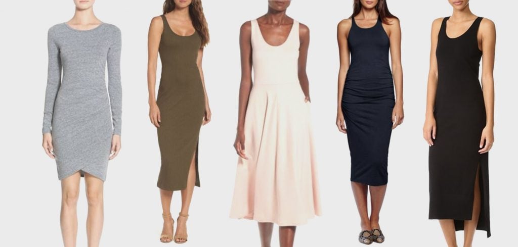 There are some travel days when denim just won’t do, and at those times, I favor a knit dress and a loose lightweight jacket. Knit dresses are the ultimate for cozy comfort and ideal for longer trips. My favorite knit dresses check the following three boxes: a neutral color, a bit longer in length, and a more minimal design. Oftentimes, my favorite finds are well under $100! These criteria, and being so budget friendly, make them the perfect piece for building a go-to alternative-to-denim travel outfit. Most often I will wear sneakers (such as these, these or these) with my knit dresses for a laid back look, but depending on the occasion, flats or ankle boots can be great options as well. Most knit dresses do not have pockets, which sometimes can be problematic, but the added lightweight jacket saves the day!