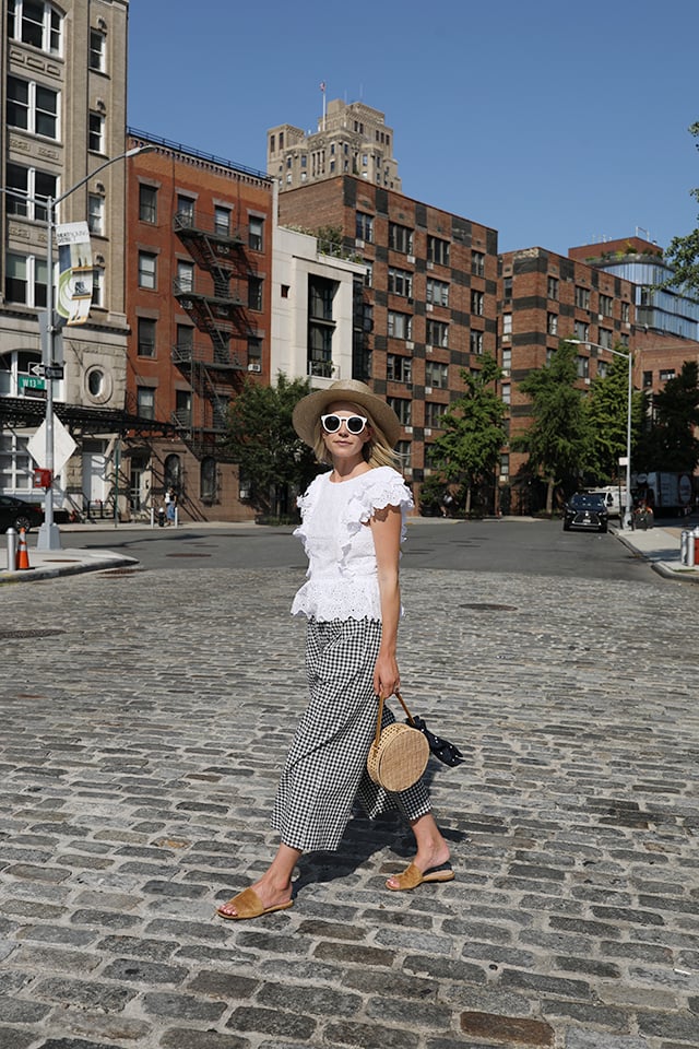 Gingham Pants: Pixie Market. Eyelet Top: HM (only $50, shop more of my eyelet and lace picks under $100 here). Sunglasses: Leonard II. Bag: Serpui. Hat: Sold out, similar here! Polka Dot Scarf.