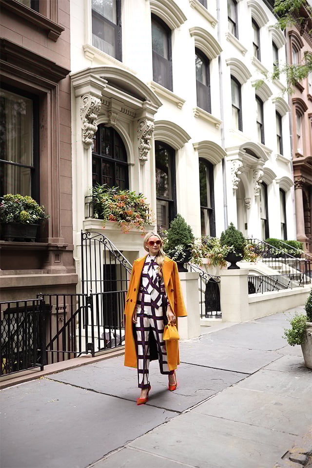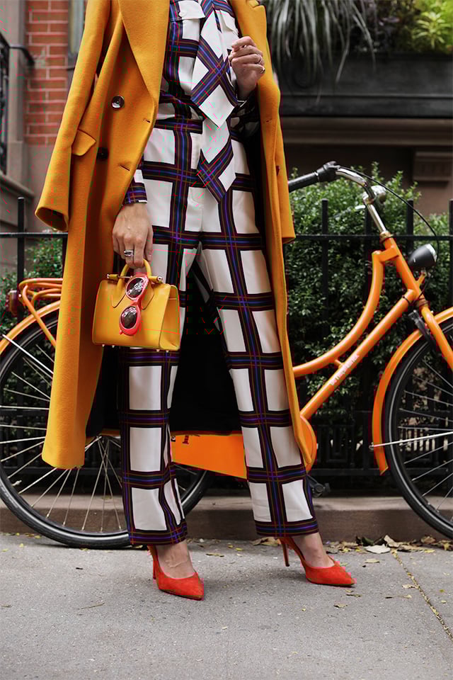 Silk Check Pants and Bow Blouse: Tory Burch (shop all the chic check pieces below). Coat: Zara. Heels: Old, similar. Bag: Strathberry.