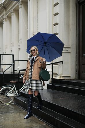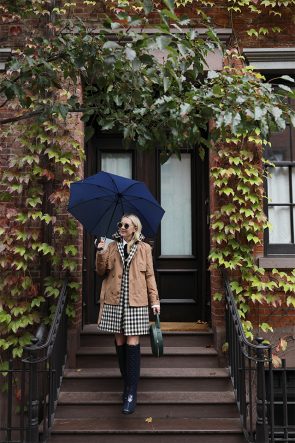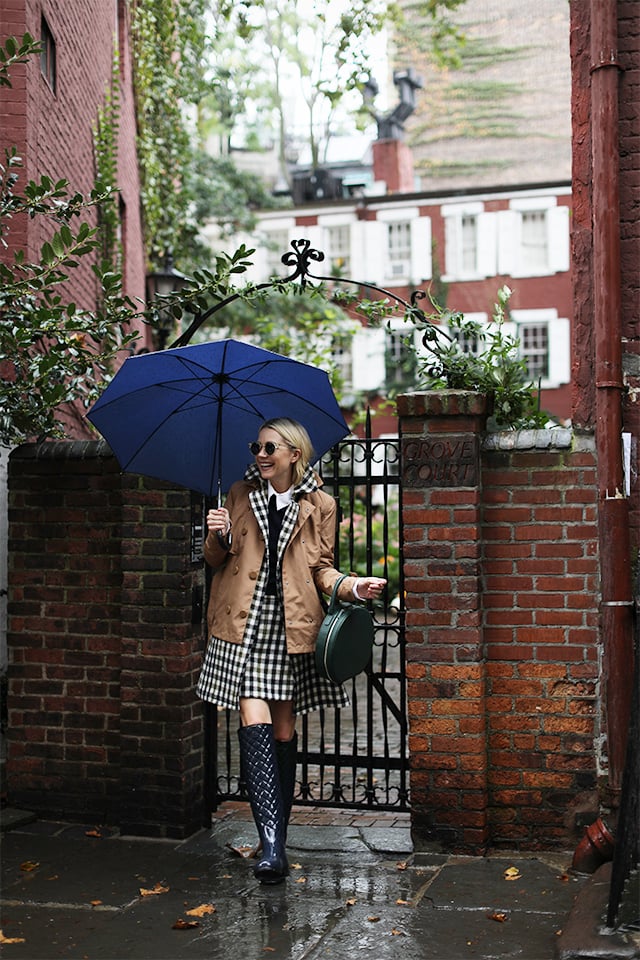 ONE // Boots: Hunter Refined over the knee boots. Trench: Hunter Refined Trench jacket. Umbrella: Hunter. Plaid Skirt & Coat: J.Crew. Sweater: Alice and Olivia. Bag: Mansur Gavriel.