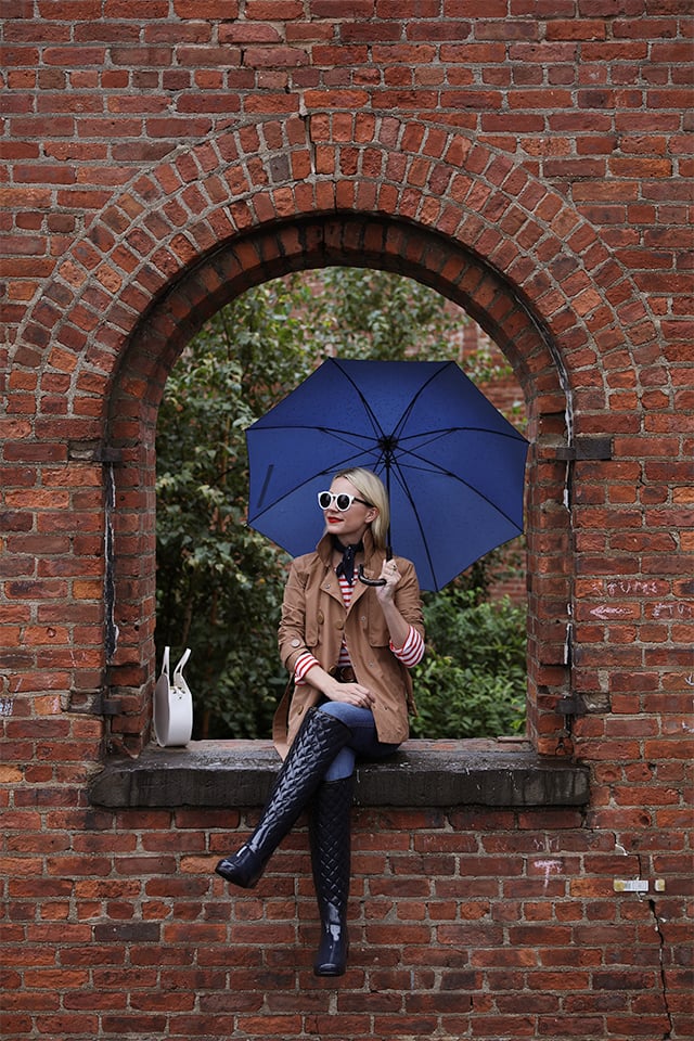 TWO // Boots: Hunter Refined over the knee boots. Trench: Hunter Refined Trench jacket. Umbrella: Hunter. Denim: Madewell. Tee: J.Crew. Bag: Clare V. Lips: Stila Beso.