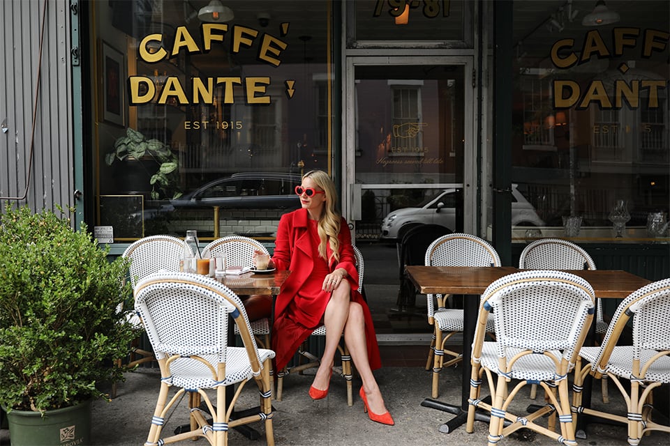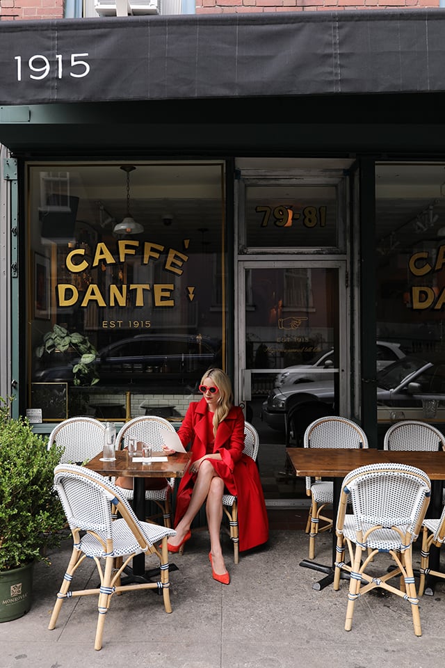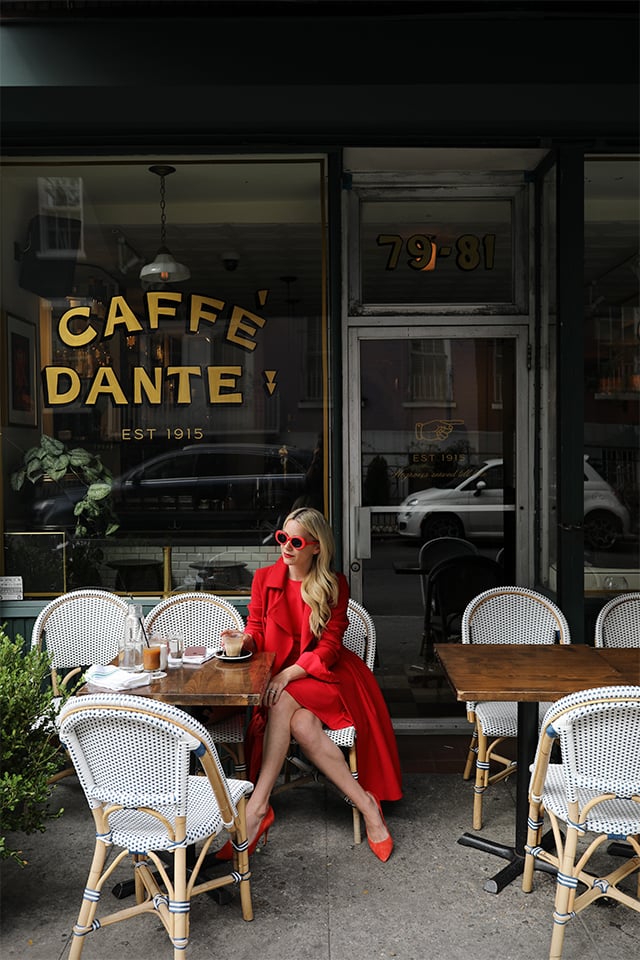 Red Dress: Kate Spade (under $200! Shop all my favorite red for fall below). Shoes. Coat: CH Carolina Herrera (not sold online but similar here). Sunglasses: Sold out similar here! Location: Dante in Greenwich Village.