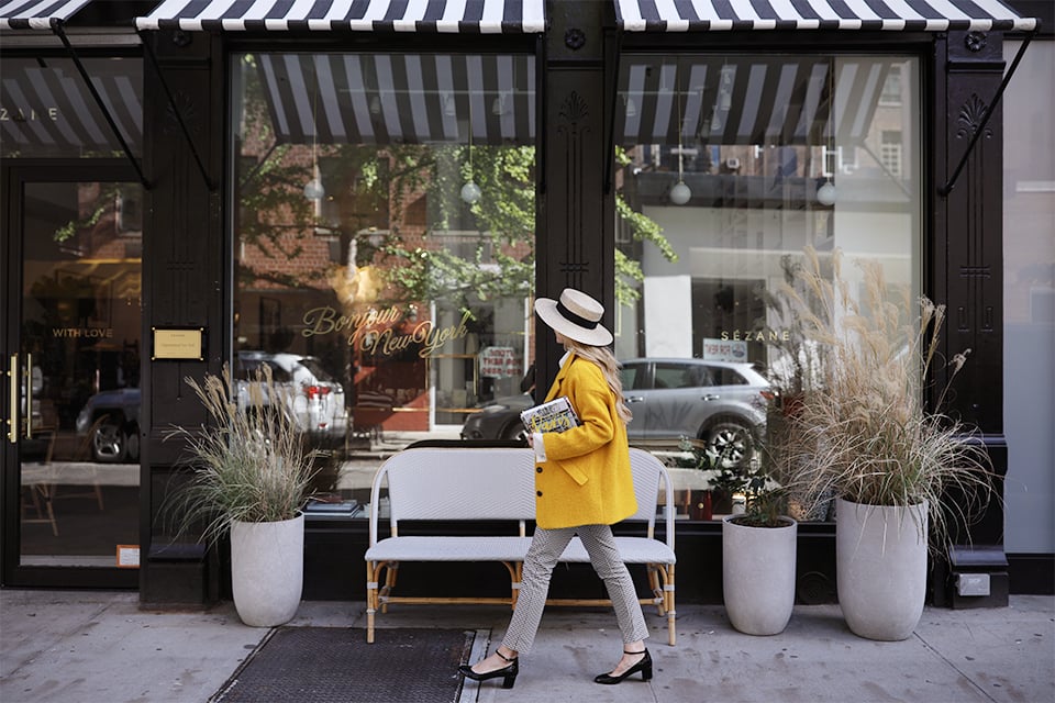 Yellow Coat: Sézane. Shoes: Sézane. Pants: Sézane. Both my pants and shoes are from La Liste, Sézane’s more permanent, timeless collection. Shop all the La Liste pieces here. Bag: Blair Bag for FEED. Sunglasses: Elizabeth and James. Hat: Gucci. Sézane is now open in Nolita! The store is beyond charming- see all the details here. Thank you to Sézane for partnering on this post.