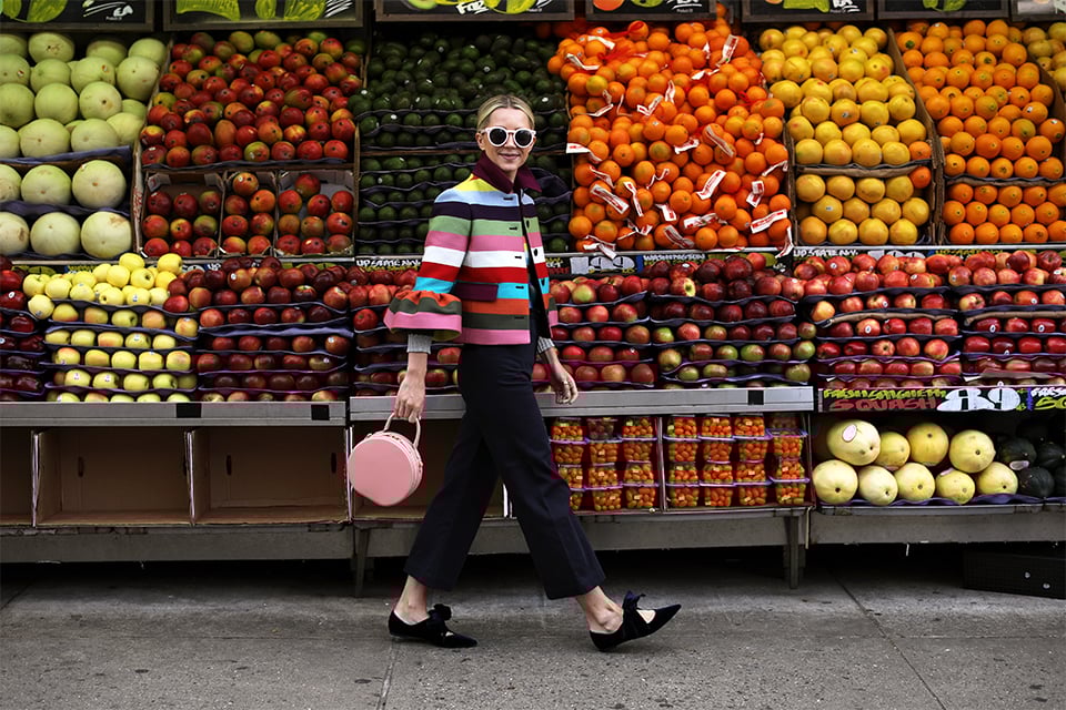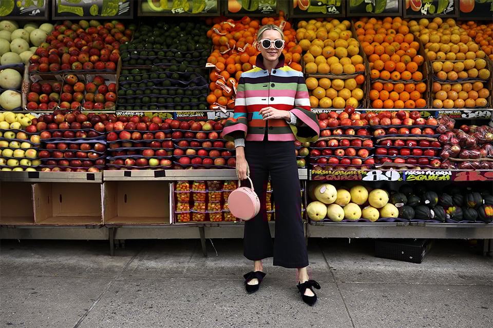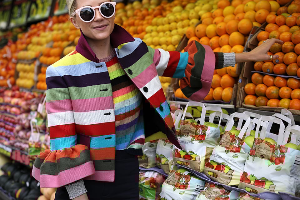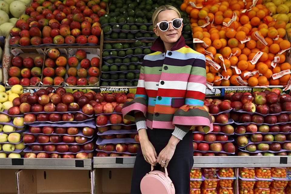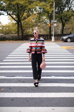 Jacket: Mary Katrantzou (matching skirt here). Pants: Sea NY (I also have them in green as seen here and plaid as seen here!). Bag: Mansur Gavriel. Shoes: Tory Burch. Sunglasses: Illesteva (sold out similar here). Sweater: Gucci (sold out but cardigan version here and red, white and blue version here // I am also loving that GAP brought back the crazy stripes! Shop them all here).