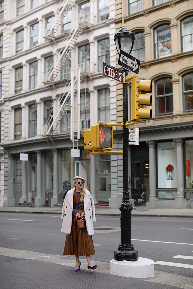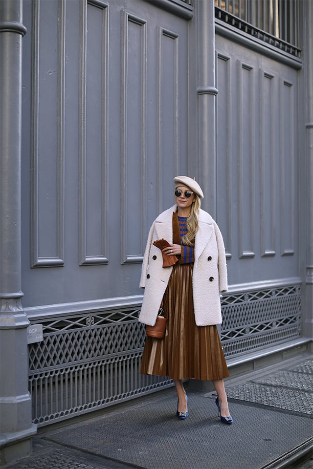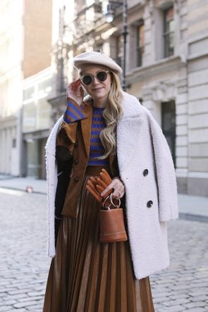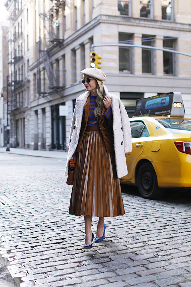 Sweater: By Malene Birger (on sale). Blazer: Veronica Beard (last seen here). Shoes: Manolo Blahnik (also love the flat version). Skirt: HM (under $100). Coat: Topshop (I now own it in three colors! See me in the pink here and brown here.) Beret. Bag: Simon Miller.