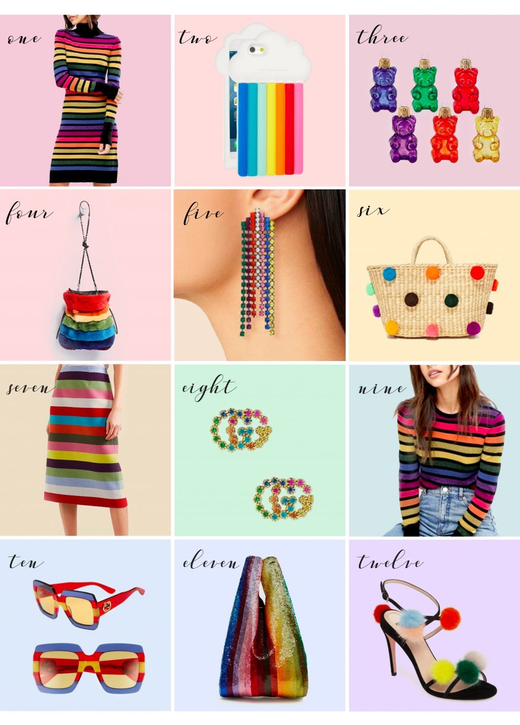I’m adoring all of the rainbow fashion inspired pieces available in the market (as seen in a recent post here). Vivid color palettes mixed with stripes is right up my alley! This trend made headlines a few years back with the now infamous striped Gucci sweater. I was immediately on board. Check out this pleated skirt post from almost exactly one year ago, and this more casual pink blazer post from nearly two years ago! I’ve certainly gotten a lot of mileage out of my favorite multicolored sweater! This rainbow fashion trend certainly has bright staying power through winter, and will continue to provide the perfect pick-me-up under a coat in the cold or front and center for your warm weather getaways. There is a full spectrum of punchy pieces available, from apparel to accessories to shoes. I love color, stripes, and having fun with my looks, and the below twelve pieces are a vibrant reflection of my often quirky sense of style. It’s truly amazing how much a little (or a lot of) of multicolor can change your mood and outlook. Click below for details of all of these pieces!