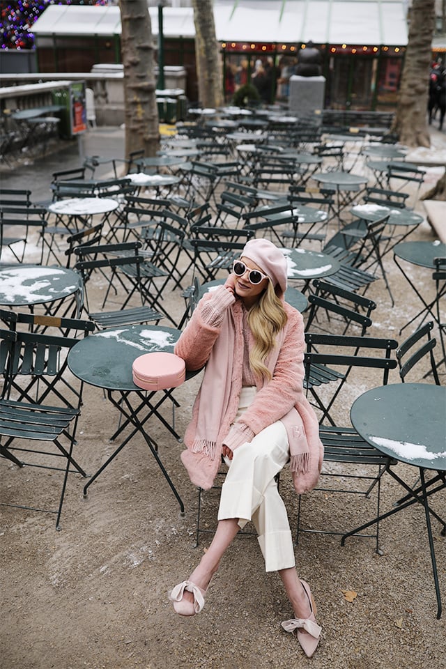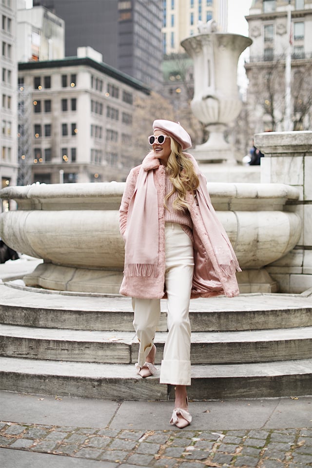Pink Faux Fur Coat: Dorothy Perkins (under $120, also bought this faux fur one). Pants: Sea NY (love this silhouette- I have worn these in other colors here, here and here). Scarf: Burberry. Shoes: Sold out, but similar bow pumps in pink here! Bag: Mansur Gavriel. Beret: Topshop (also pearl embellished here). Thank you to Nordstrom for partnering on this post.