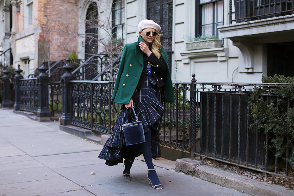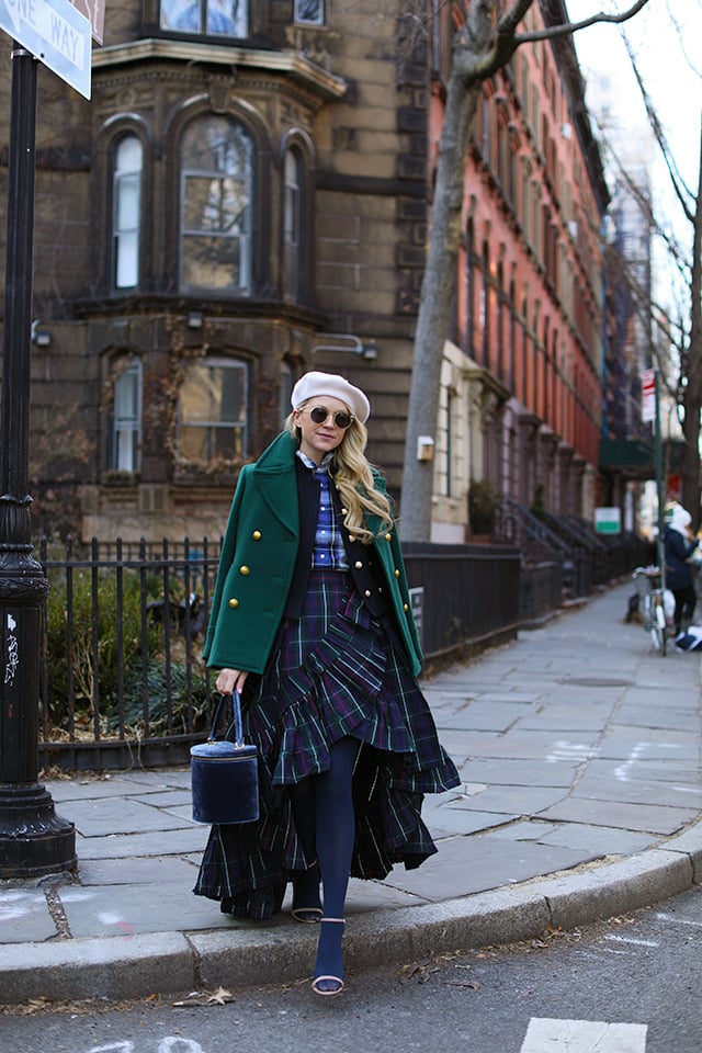 Wrap Skirt: Jcrew (I fell in love this this cut and shape from Jcrew and own it in two other colors – as seen here and here – so when I saw it in plaid I had to have it!). Top: Jcrew (also love this plaid one and this bow button up on sale). Military Jacket: Burberry. Bag: Staud. Peacoat: Jcrew. Tights: HUE (see how I wore my other colors here). Beret: Nordstrom (as you know I have been SUPER into berets lately- as seen here, here, here, here and here!).