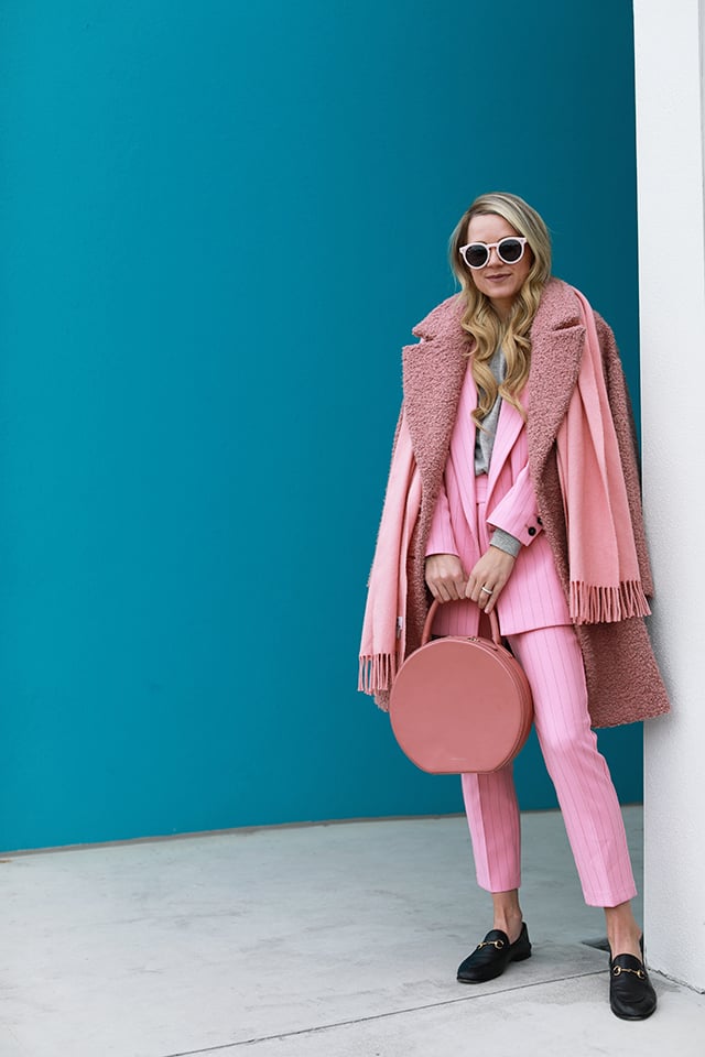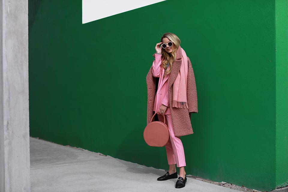 Pink Blazer: Ganni. Pink Pants: Ganni. Loafers: Gucci (loafers I love for less). Cashmere Sweater (also talked about it here). Bag: Mansur Gavriel (one of my most worn pieces – see me wearing the circle bag here and here). Coat: Topshop (on sale and I own it in 3 colors). Scarf: ACNE. Super into suiting- talking about it here!