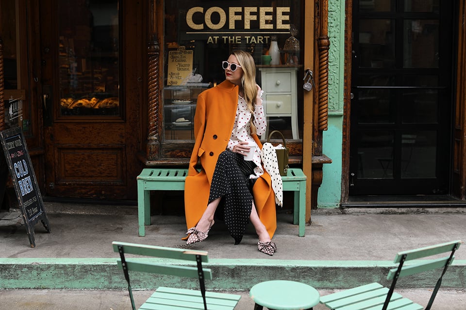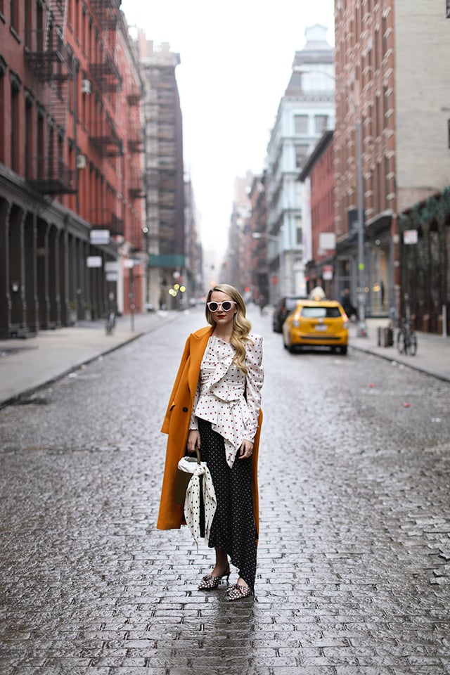 Polka Dot Top: Self-Portrait (also love this star one and this swiss dot one). Skirt: Tibi (old, similar polka dot one here). Bag: Cafune. Shoes: Zara. Lips: NARS ‘don’t stop’ (I know I am cheating on my Stila!). Coat: Zara, old.
