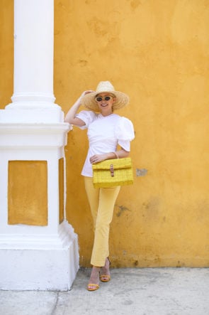 TWO // White Puff Sleeve Top (I love this top because it has such great stretch to it. I can’t wait to wear with high waisted cropped pants or a high waisted full skirt!). Yellow Bag via Etsy. Yellow Straight Leg Denim. Yellow Heels. Yellow Retro Sunnies. Hat.