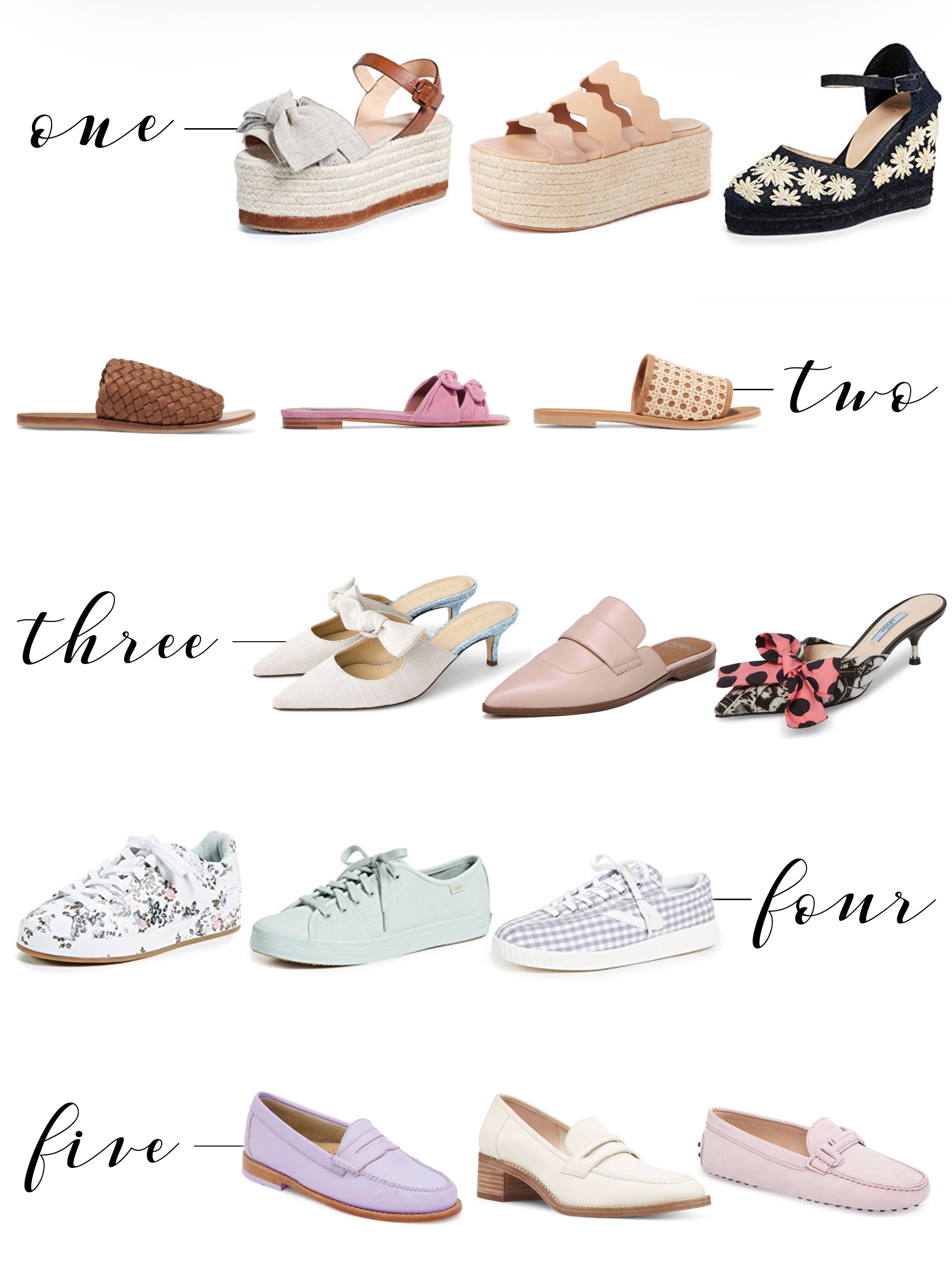 New spring shoes! There are five styles that are on my radar this spring. The unexpected espadrille is at the top of my list this season. Be it with a bow accent or scallop straps in platform profile, or a wedge heel with a raffia embroidered floral motif, these not-so-normal espadrilles will compliment any little white dress for spring. Next up, the slide. Believe it or not, these are your perfect city shoe. Comfortable, easy, and with a minimal break in period (new spring, new blister is not a cute look). I’m favoring the braided woven leather and vintage-inspired rattan options (see my other post on woven shoes for spring here), but everyone knows I can’t pass up a single bow, let alone a double bow! The mule is your more feminine alternative to the loafer, and the pointy-toed mule differentiates just a bit further as it takes on a bit more trend. From a rebellious print to a solid classic to a low-heeled bow, these will all look equally chic back to a dress or skinny denim. You can’t head into spring without a new go-to sneaker, and this season, I’m trading in my typical all-white tennis shoe for something a bit more fun. From floral printed, to an all over green, to a pastel gingham (these are also available in pink!), there are cute options for all. And last but not least, the loafer. From the most traditional silhouette in a new must-have spring color, to a more feminine take on a classic (with a blocked heel!), to a driving loafer in a pretty pastel, all of these options are calling my name and I simply can’t pick a favorite!