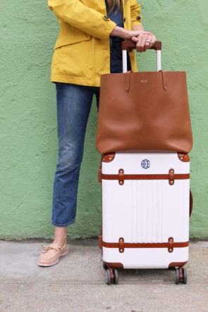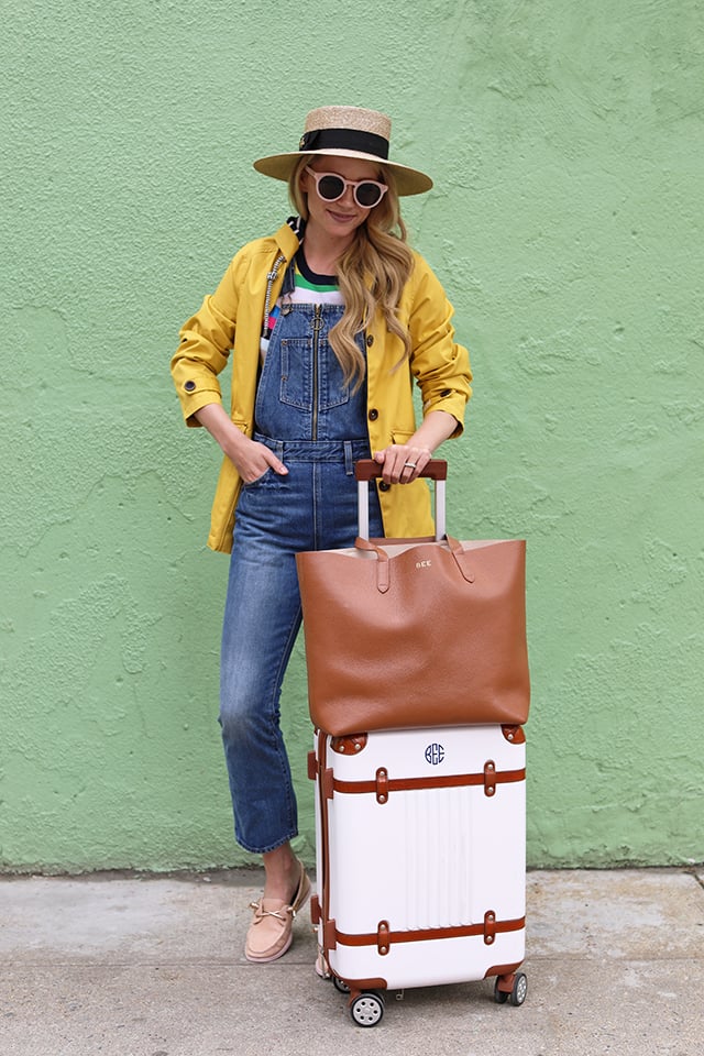 Overalls: Sold out, similar here. Striped top: Nordstrom. Boat shoes: Sperry. Jacket: Joules (in six colors). Suitcase: Mark and Graham (now in pink). Tote: Cuyana. Hat: Gucci.