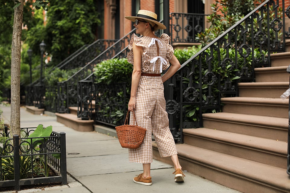 Gingham Jumpsuit: English Factory. Sneakers: Sezane (absolutely love them and have them in 3 colors!). Bag: Dragon Diffusion. Sunglasses: Illesteva (find lots under $100 here). Hat: Lack of Color. Belt: J. Crew, old but also love this one.