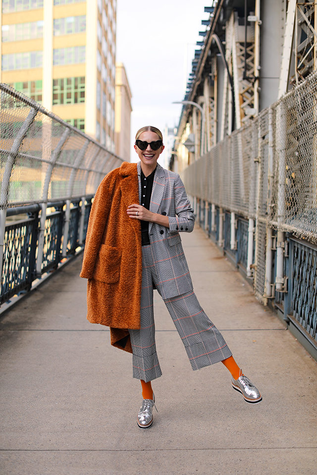 Blazer: Atlantic-Pacific X Halogen. Pants: Atlantic-Pacific X Halogen. Belt: Atlantic-Pacific X Halogen. Shoes: Atlantic-Pacific X Halogen. Tights: Atlantic-Pacific X Halogen. Sweater Polo: Atlantic-Pacific X Halogen. Teddy Coat: Atlantic-Pacific X Halogen. Bag: Senreve. Sunglasses: Saint Laurent.