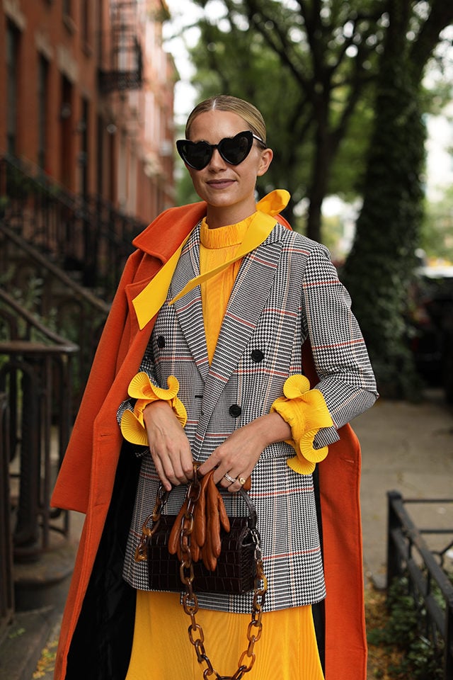 Blazer: Atlantic-Pacific X Halogen. Pants: Smythe. Top:Tibi (also here and here). Bag: Staud, also love the green here (from Hampden Clothing). Sunglasses: Saint Laurent. Coat: Zara (last seen here). Heels: Old, similar here. Lilac Gloves: Atlantic-Pacific X Halogen. See another version of this color combination in this post.