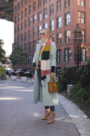THE MIDI COAT // $249 // This coat is one of my favorite pieces in the collection. It has a more tailored fit at the shoulders and waist and is longer in length. While it runs true to size, it is purposely cut tighter to the body, so you may want to consider sizing up if you are planning on wearing bulky sweaters or multiple layers underneath! The sweaters in the line that have more fitted sleeves, such as the solid lurex and striped turtleneck (both pictured above and more details below), pair so well with this gorgeous coat! You can see it styled both here and here.
