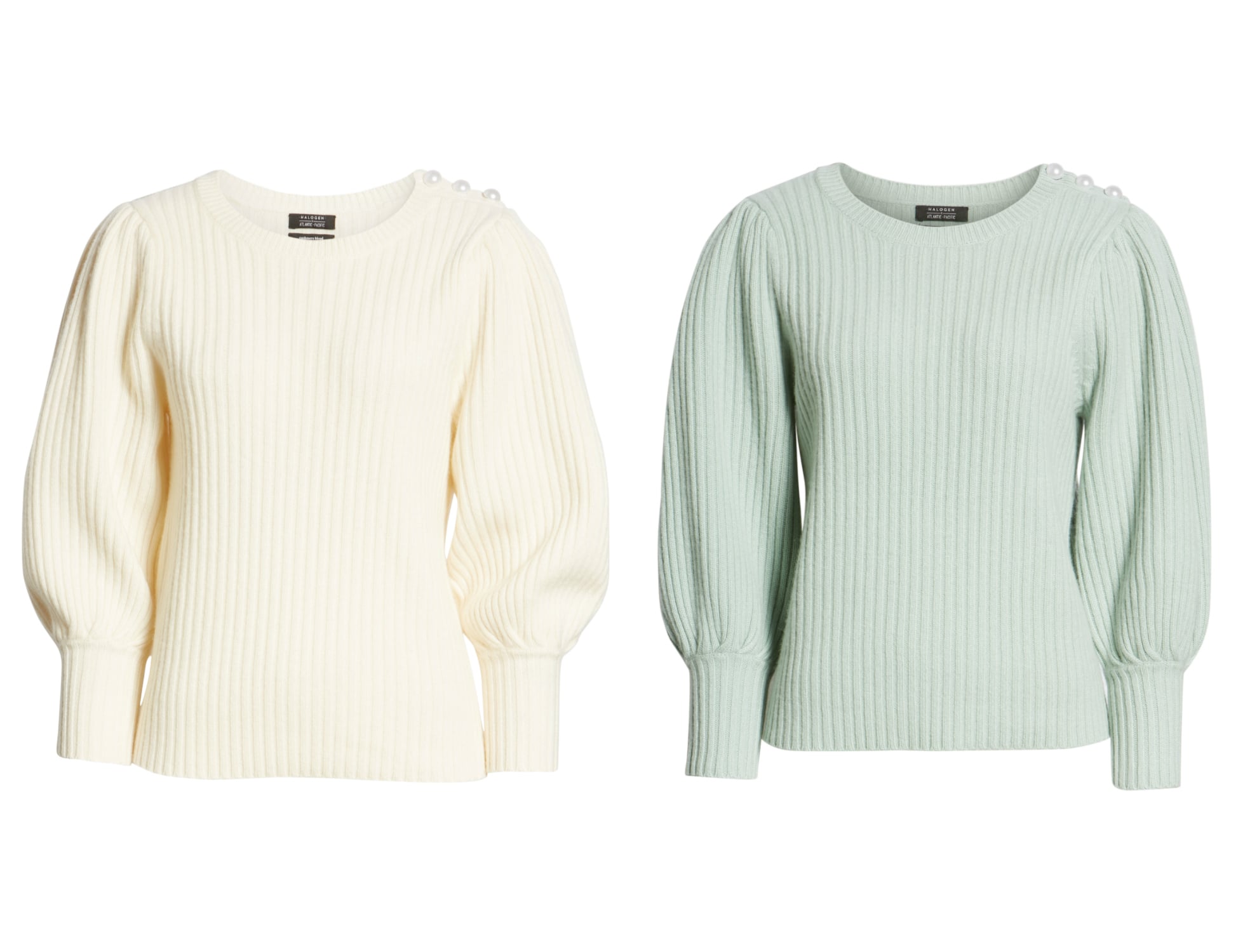 CASHMERE BLEND BLOUSON SLEEVE SWEATER // $189 // We have a wide array of sweaters in the collection, and this one is by far the most feminine. All of the details were considered, from the pearl button shoulder details, to the wider rib, to the cashmere blend to the blouson sleeve. It is fitted through the body but the sleeves are purposefully more voluminous to create a blouson!