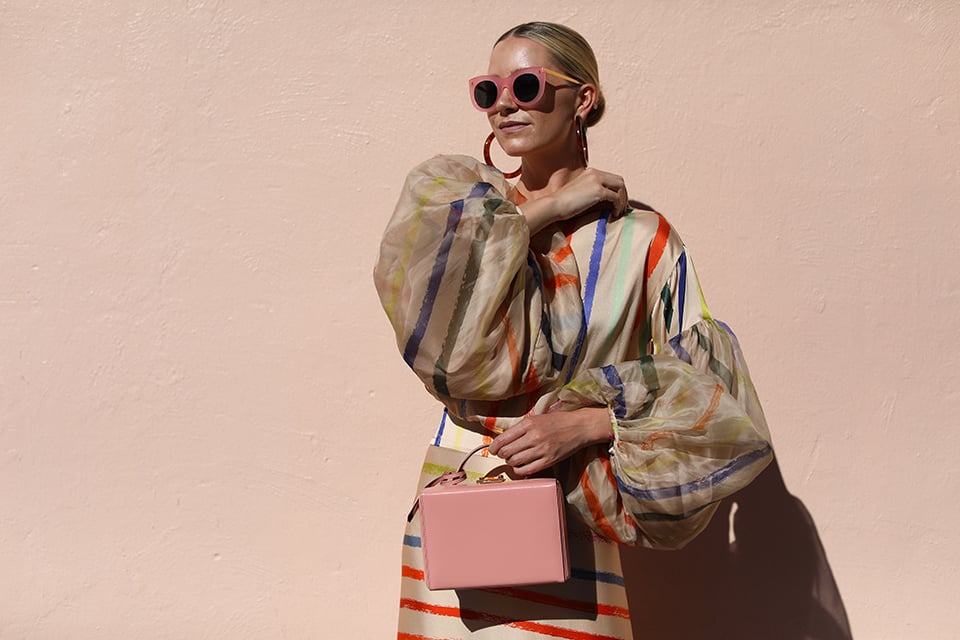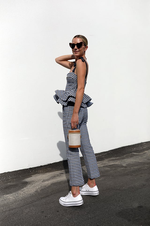 two // Top: Silvia Tcherassi. Bottoms: Silvia Tcherassi. Shoes: Converse. Bag: Paravel. Sunglasses: Saint Laurent.