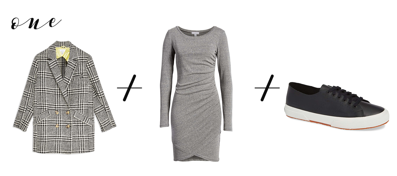 A neutral knit dress is my go-to for longer travel days. I keep it polished with a patterned coat and streamlined monochromatic sneakers.