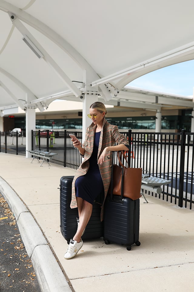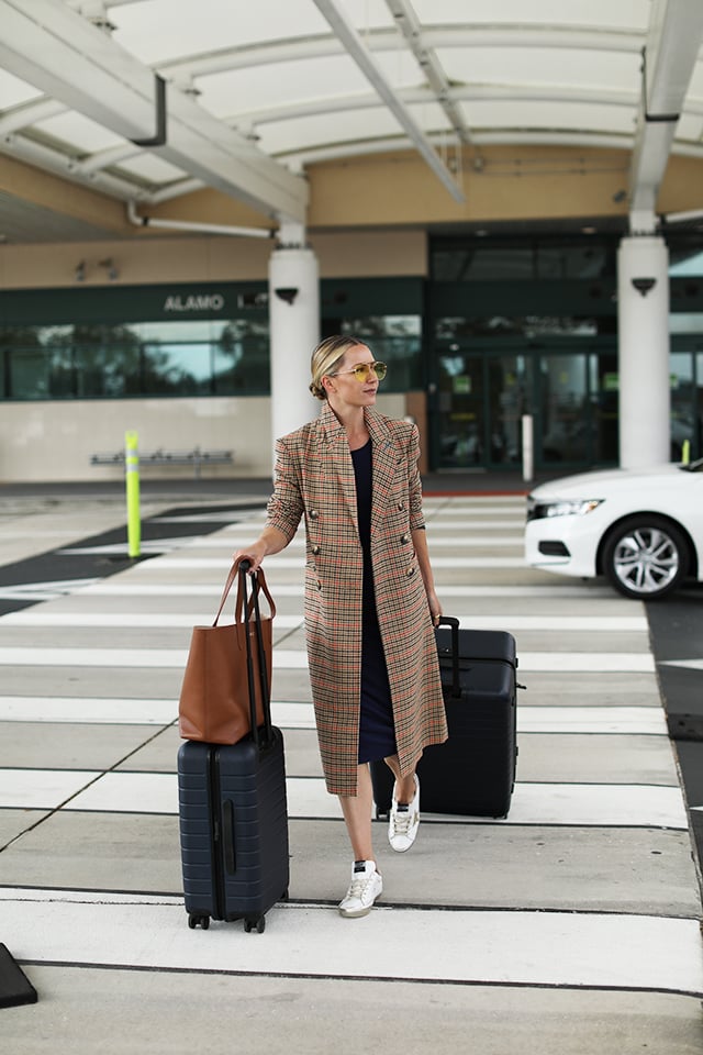 Knit dress, under $100 and available in 10 colors! Also check out this flattering long sleeve dress and this dress – I own both and LOVE them. Coat: Topshop. Shoes: Golden Goose (also love this more affordable option at under $50 and comes in almost every color you can think of). Luggage: AWAY (I have the large hardshell and the carry-on, but am seriously considering the new ‘bigger carry-on‘). Also how cute are the travel stickers?!