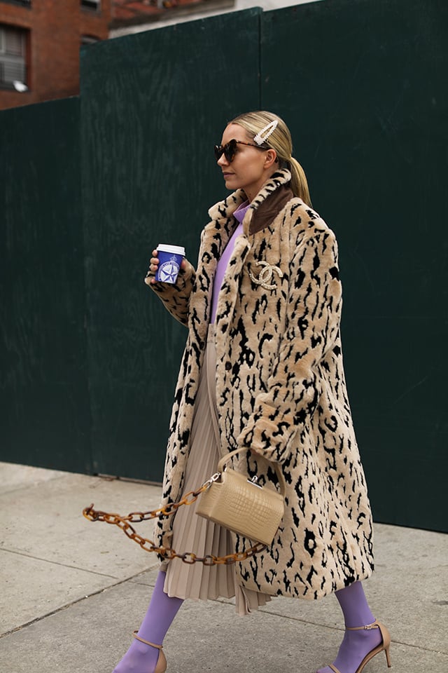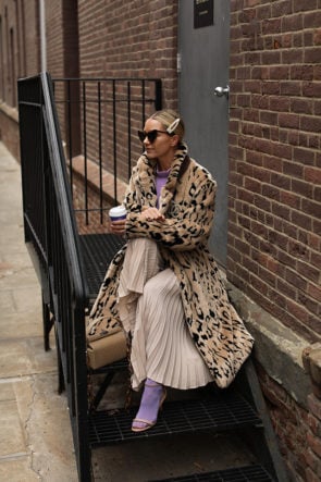 Skirt: Vince. Top: Tibi (also on sale here and here). Lilac Colored Tights: on sale here. Shoes: old, similar here. Coat: Loéil. Bag: GU_DE. Sunglasses: Saint Laurent. Hair Clip: Etsy. I also wore these!