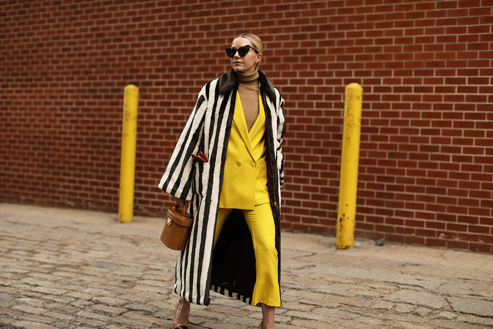 one // Coat: Staud (also love this rainbow one and this one). Suit: Topshop (from two years ago but shop a very similar yellow one here, pink one here and purple one here!). Shoes: Zara (from 2011 haha but similar here). Sweater: Everlane. Sunglasses: Saint Laurent. Bag: Mark Cross.