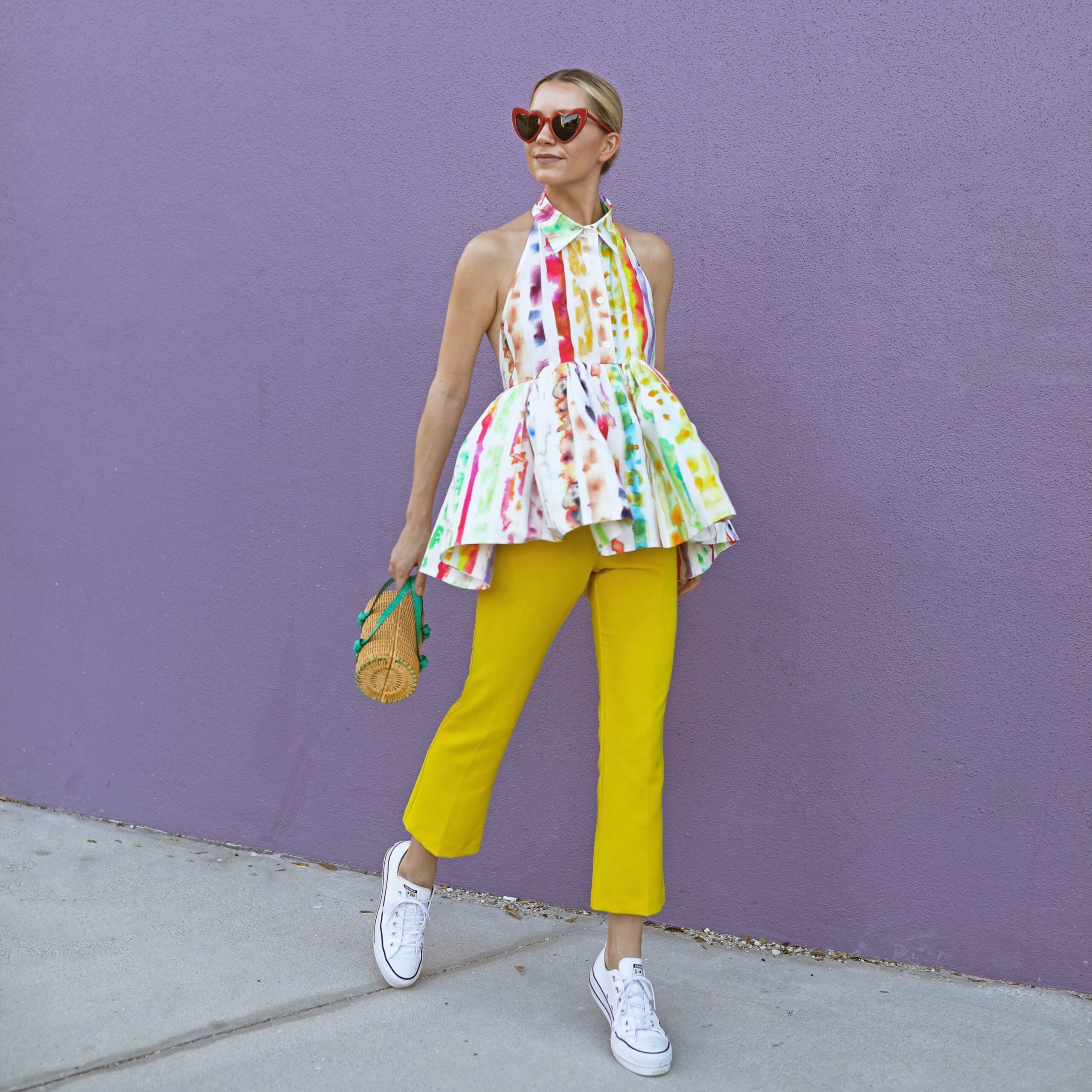 Top: Rosie Assouline. Pants: Topshop (similar yellow denim here). Shoes: Converse. Sunglasses: Saint Laurent. Bag: Pamela Munson.