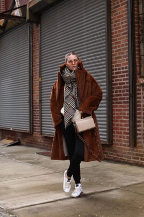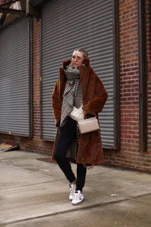 Joggers: Nordstrom. Coat: Avec Les Filles. Shoes: Golden Goose. Sunglasses: Dior. Sweater: Old, shop similar here. Scarf: Old.
