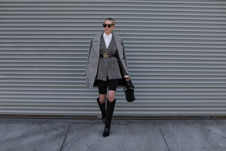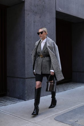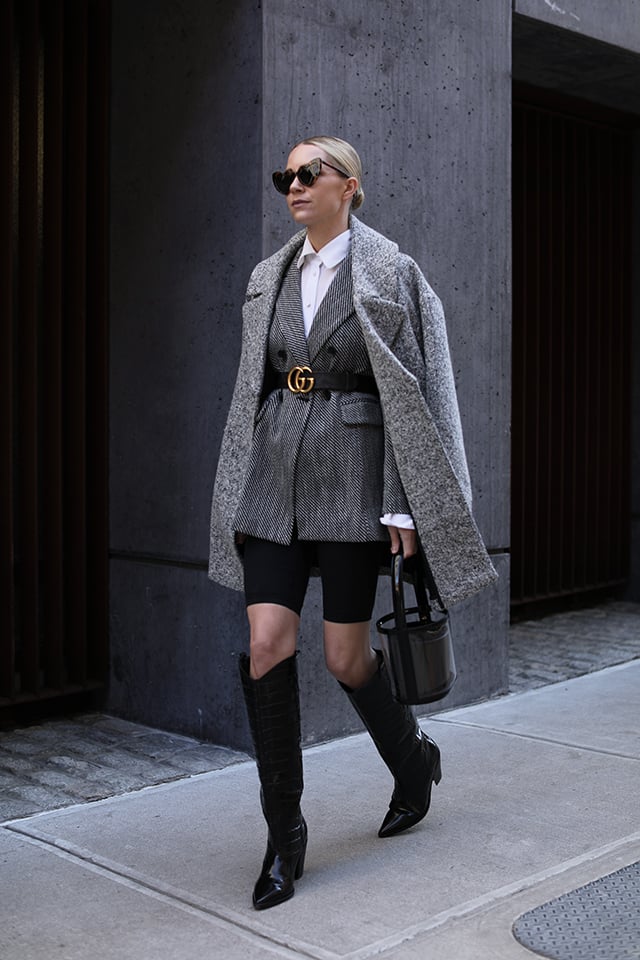 Bike Shorts: Nordstrom. Blazer: 1901. Belt: Gucci (also might pull the trigger on this Gucci belt). Sunglasses: Saint Laurent (back in stock and in new colors). Boots: Sigerson Morrison. Bag: Staud (you know I love a good clear bag!). Coat: Topshop from Nordstrom last year!
