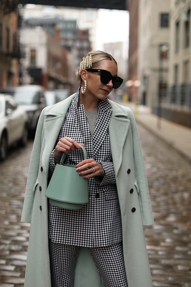 Pants: ASOS. Blazer: ASOS. Coat: Atlantic-Pacific X Halogen. Bag: Mlouye. Earrings: Lele Sadoughi (also similar here). Hair Clips: Amazon. Sweater: Everlane. Sunglasses: Le Specs (under $100).