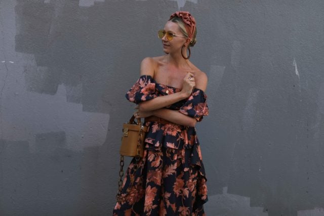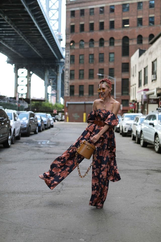 Floral Top: ASOS. Floral Pants: ASOS. Headband: Jennifer Behr. Sunglasses: For Art’s Sake. Bag: Mark Cross. Earrings: Cult Gaia now on sale.