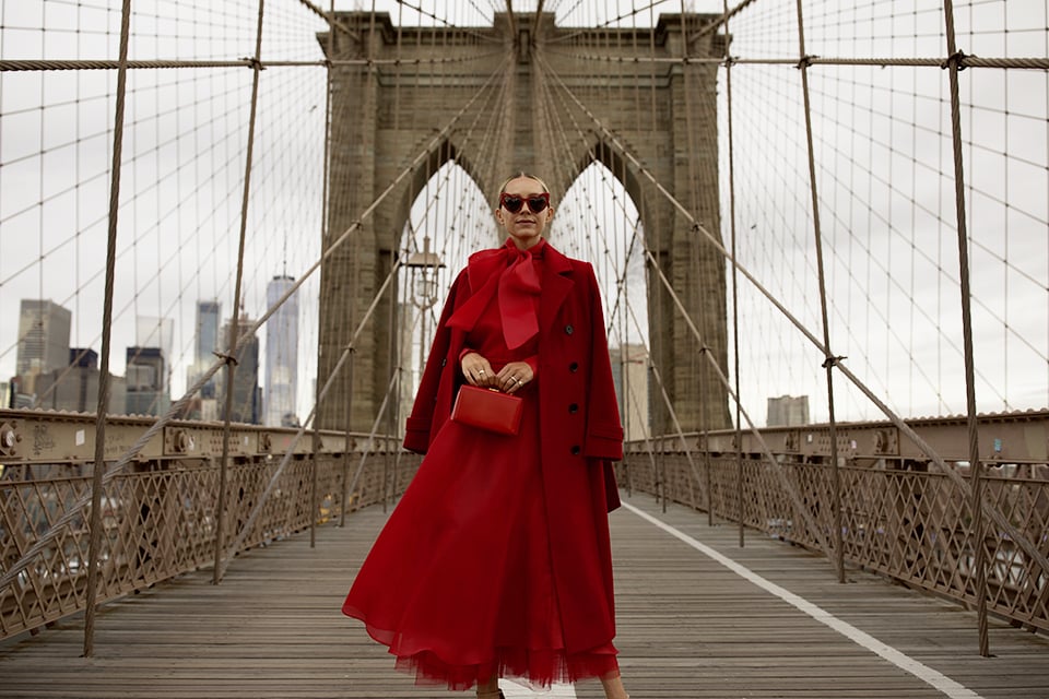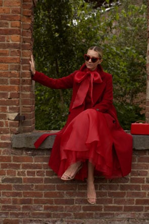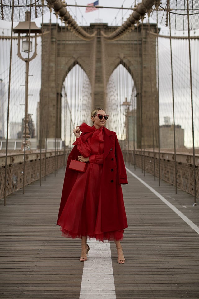 RED-TO-TOE // Coat: Atlantic-Pacific X Halogen. Skirt: Atlantic-Pacific X Halogen. Bow Top: Atlantic-Pacific X Halogen. Shoes: BR (old). Bag: Mark Cross. Sunglasses: Saint Laurent.