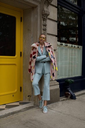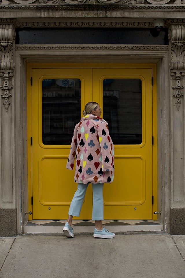 I warned you already – this will be the fall of faux fur – so naturally we dreamed up my ultimate faux fur creation in the form of this coat. Perfectly paired back to this light blue suit and diamond print blouse, this is what my fashion heart desires.