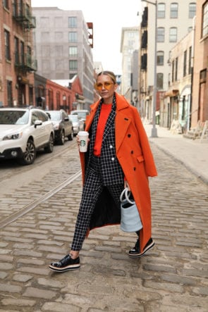 Skirt: Novis. Shoes: Golden Goose. Sweater: Micahel Kors. Coat: Jacquemes.