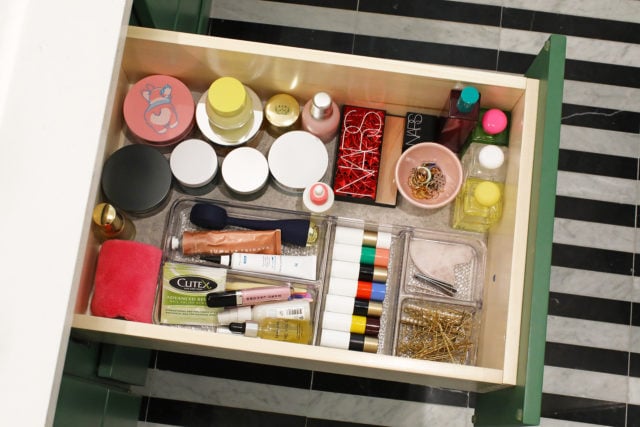 I tackled my beauty and jewelry drawers last week (the worst cluster of all in my home). I picked up this tray for my beauty products as well as these stackable trays. For my jewelry I was considering getting something a bit more refined/finished but since most of what I was organizing was costume jewelry I felt like these trays got the job done well enough.